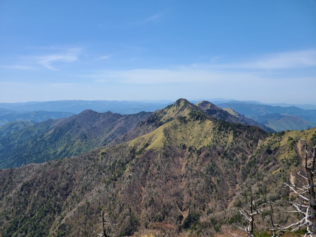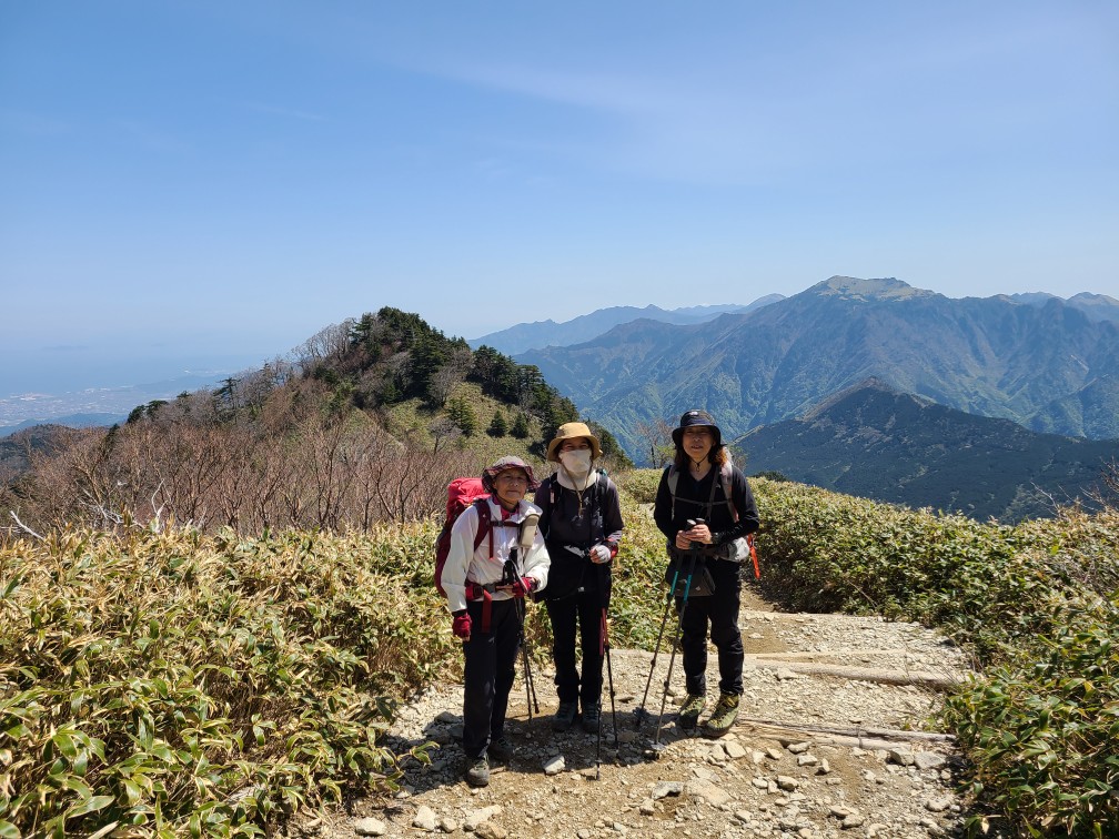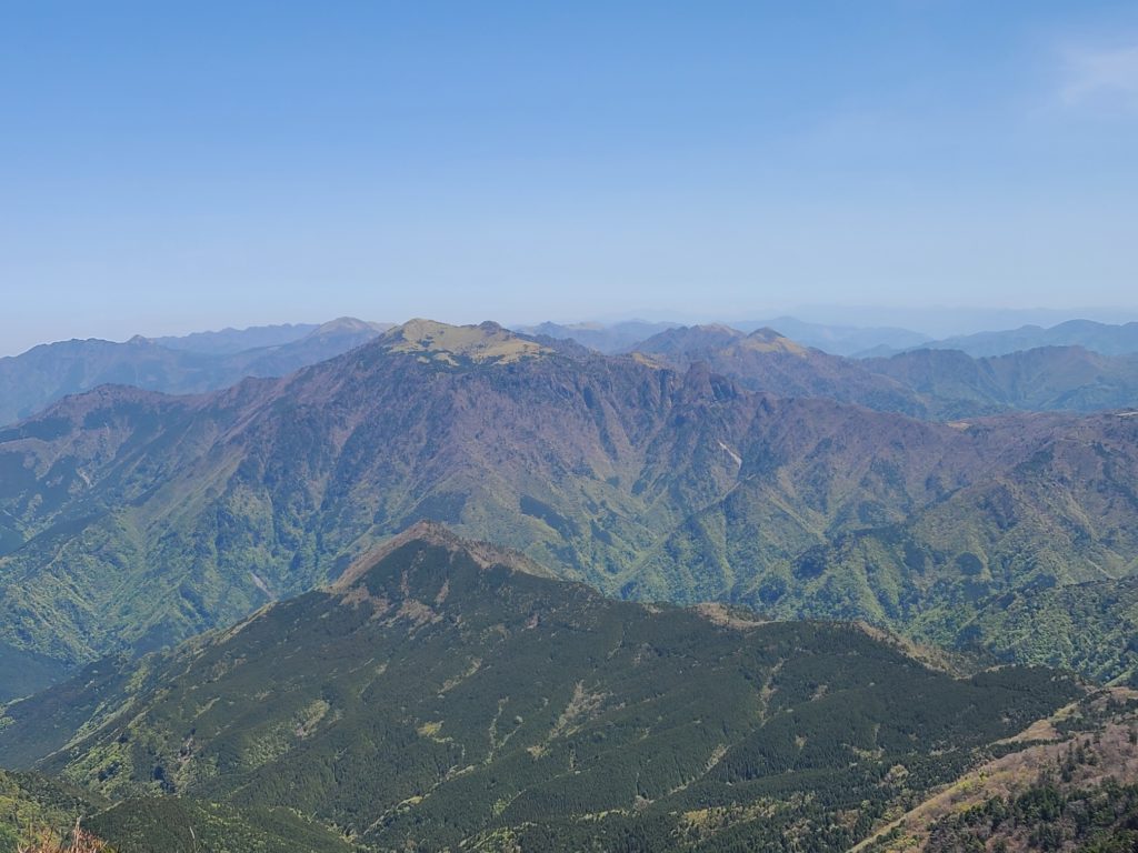 山頂から次郎笈の稜線が美しい、この時間には、昨日見えていた石鎚山方面は、雲でかすみ望めなかった。次郎笈は山一面がミヤマクマザサに覆われ、まるで草原のような美しい景色に癒されながら稜線を進む。ミヤマクマザサは、おおむね1600mから上部を覆っていて、本州中、南部の太平洋側と四国の一部に分布、亜高山帯での生育は四国のみだそうだ。この貴重なミヤマクマザサを荒らさないようにとの記載が登山ルートに掲示してあった。剣山(1955m)から(1800m)分岐まで慎重に下る。