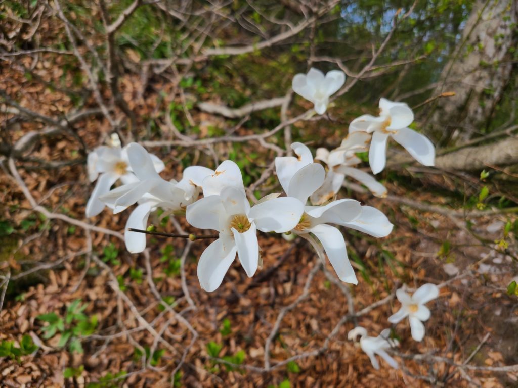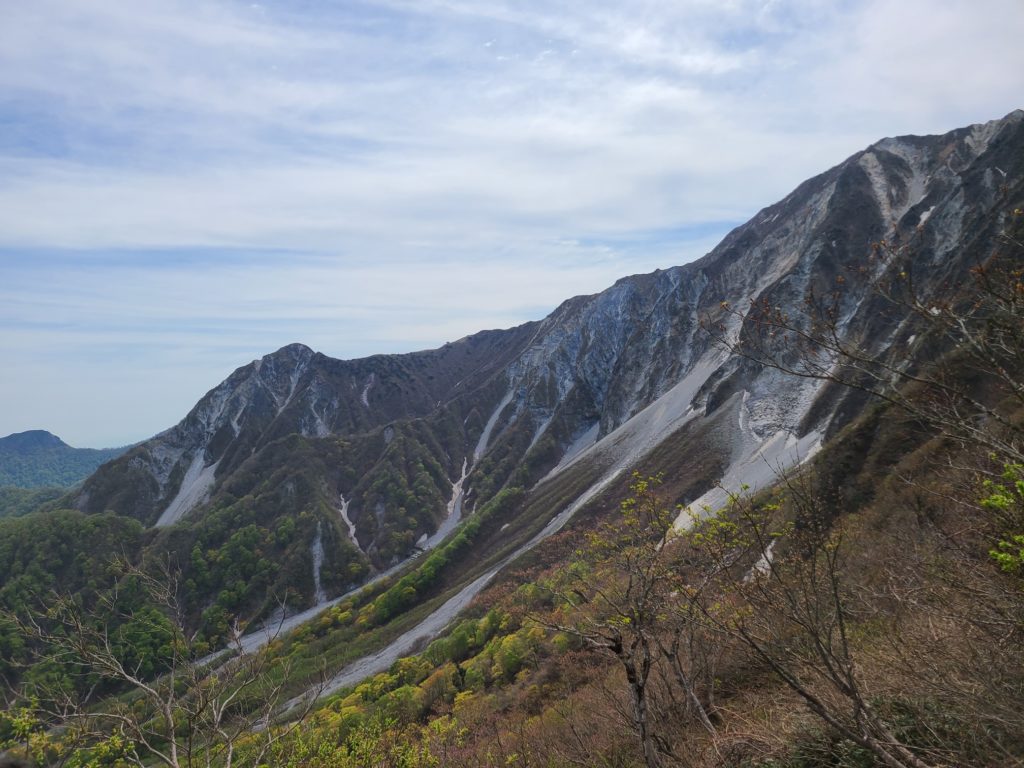 入口に石が置いてあり2個ザックに入れていきました。ほんの気持ちです。しばらくイワカガミヤ、チゴユリ、カタバミ、スミレの花に足を止めて撮影タイム。これでは進まないので少しスピードアップ。ゴールデンウイーク真っただ中、家族連も多く登山に慣れない人も多数見られました。途中標高の標識や二合目、三合目と山頂まで導かれているのでありがたい。見上げるような急登の階段を登り六合目避難小屋につきました。多くの人が休んでいて、休む場所もないので休まず上に向かいます。八合目を過ぎ森林を抜け木道になると風が冷たく上着を羽織ります。ダイセンキャラボクの緑の群生が広がっていました。私は見られませんでしたが白い花が残っていたそうです。山頂も多くの人人人、年間6万人も登るそうなので登山道も階段に整備され崩落防止に大変苦労されているようです。頂上のベンチは雛壇のようになっていて多くの人が休んでいました。私たちも隙間に座りお昼休憩をしました。山頂からは日本海が望めます。剣が峰(最高峰1729m)までは崩落がひどく通行止めになっています。弥山(1709m)が山頂となっています。岩室コースを下りたところで後ろの人から歓声が上がり見上げると虹のように環水平アークが見られました。以前も八ヶ岳で見たことがありました。六合目避難小屋先の分岐で元谷避難小屋方面に下りました。こちらは登ってくる人がいなくてとても静かになりました。木の間から北壁が見え落石の音も聞こえてきます。元谷の河原に出ると北壁が穂高の吊り尾根のようにそびえています。すごーい!しばらく眺めてトイレも行きたくなってしまったので急ぎます。大神山神社奥宮でトイレを済ませ御朱印を受け、そのあと大山寺にも寄り御朱印を受けそこの参道を下りたところに大きな駐車場があったのです。最初からこっちにしておけば~と後悔。車まで最後の歩きがきつかった。