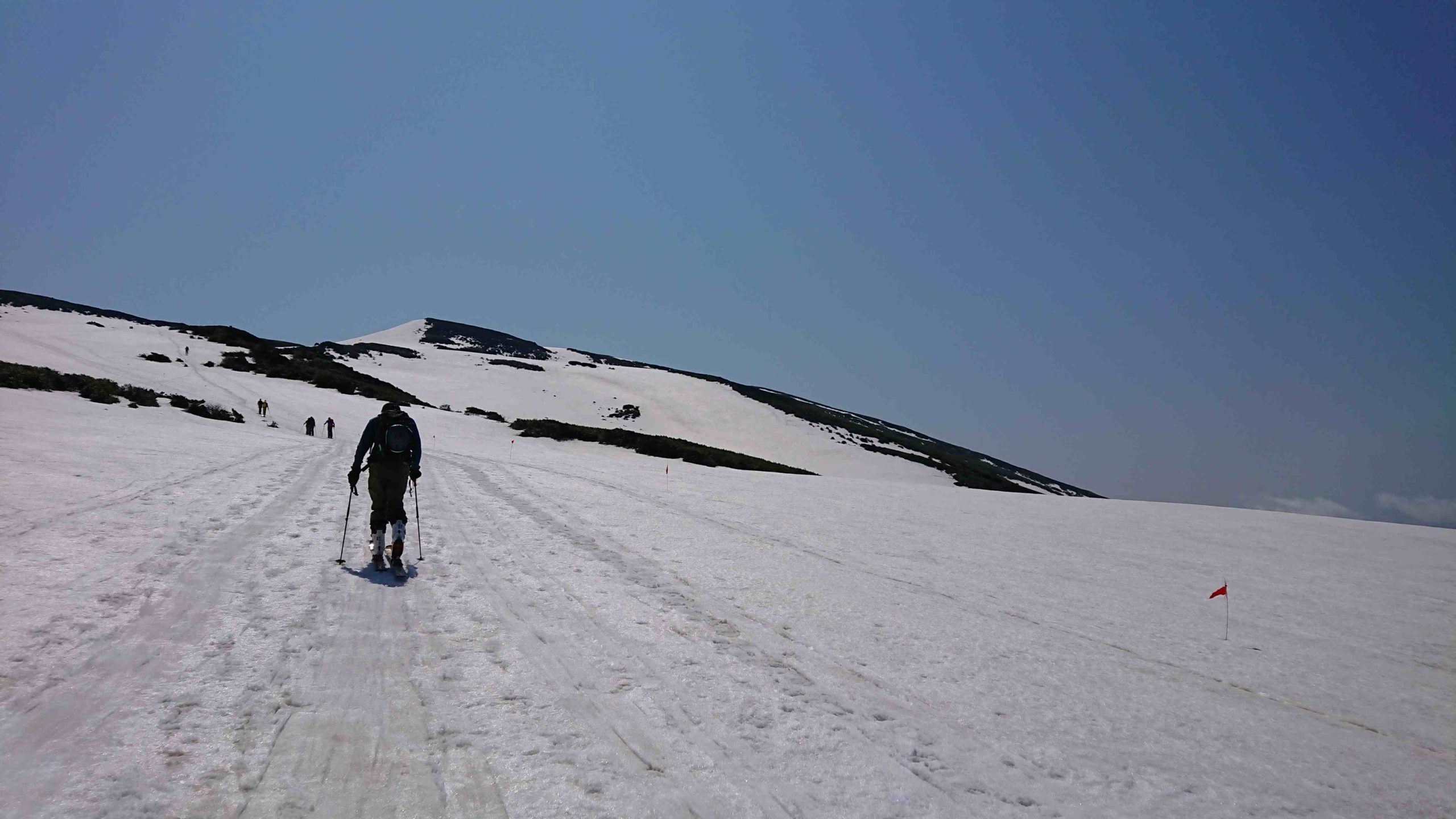 早めに秡川駐車場に移動。ほぼ満車状態でしたが登山口近くに駐車できました。天気は前日と変わってガスと冷たい強風の中の山行になり、天気の回復も見込めないようなので1900m地点で打ち切りました。滑り出したときのアイスバーンやガスも途中から消えて、広大な雪原を滑走することができました。