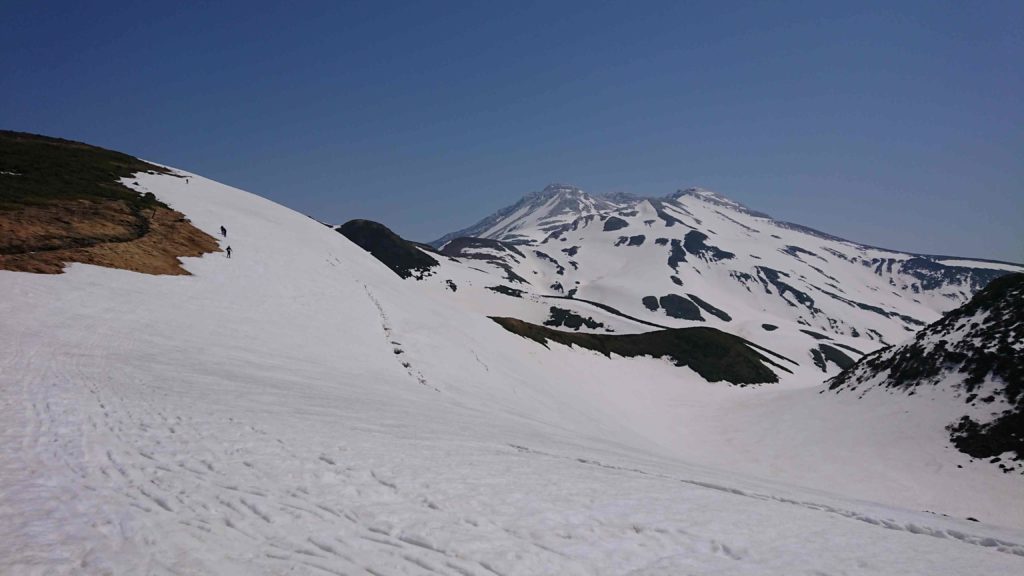 鳥海ブルーラインの通行可能となる8時にあわせて出発大平口駐車場へ移動、天気は快晴、広い雪原の中、気持ち良く登り御浜小屋へ到着、山頂へは行かず北斜面を途中まで滑り、御浜小屋まで登り返しました。反対側の鳥海湖への滑走は午後から天候の悪化が予想されたので止め、下りは登りと同じルートを滑りました。