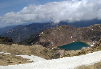 五色から弥陀が池までは、雪に消された夏道に注意しながら歩き、白根の登りは浮石や日陰には氷もあったが順調に頂上に着いた。360度の展望を楽しむ。ここ数日の天候らしく、中禅寺湖上空や南の山々方面には、早くも雲が立ち上がりはじめ風も出てきたので早々に下山。避難小屋、前白根山を周回、外山尾根を早足で下り、やしおの湯で汗を流して帰宅した。