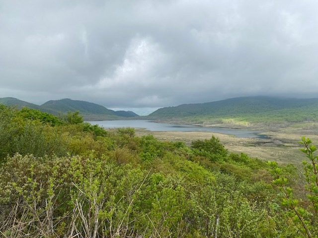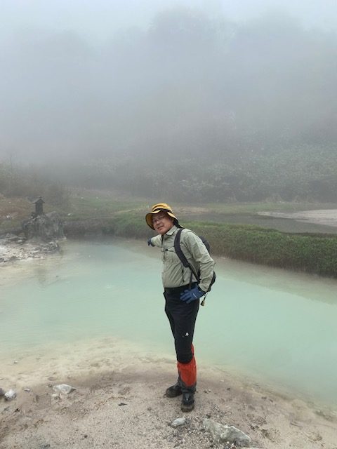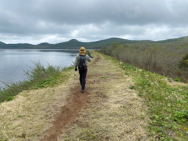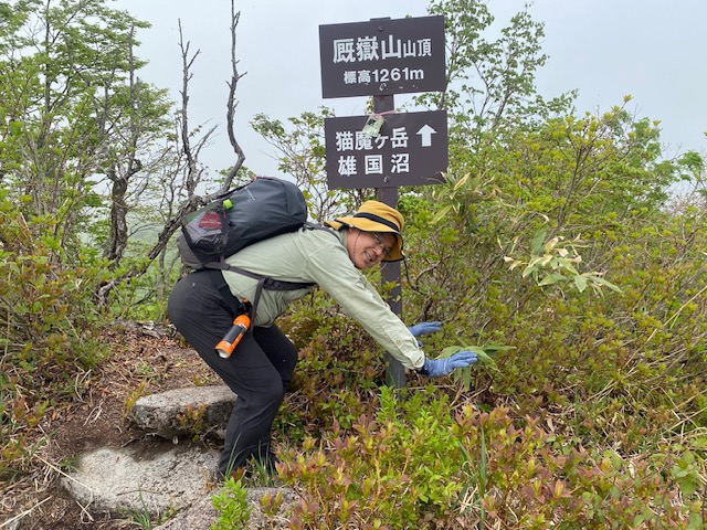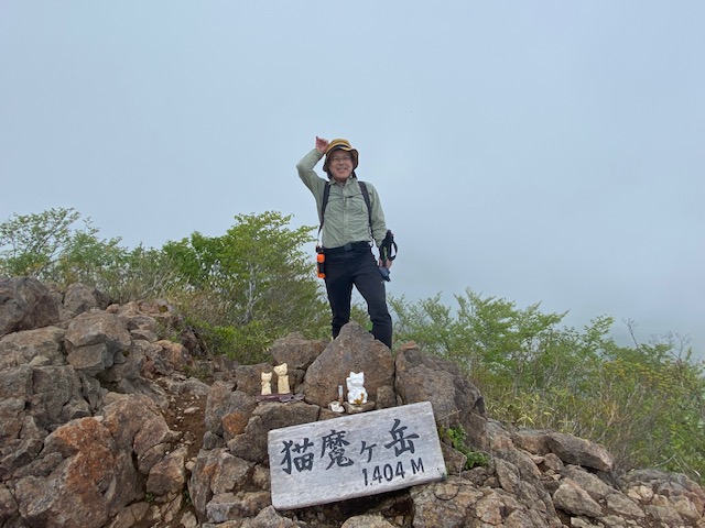 <詳細報告>小山を4時に出発、仙台から合流するメンバーと厩岳山登山口駐車場で6時30分待ち合わせ、一台をデポして、翁島駐車場には6時40分到着。7時にスタート。ガスガスの中、初めは緩やかな登りでそのうちに岩の多い登山道となり、急登になる。登山者を4人くらい追い抜いたが、それ以外はいない。ガスで景色が全く見えず、蒸し暑いので汗がすごい。水分補給を十分しながら登る。途中スミレやミネザクラ、ミヤマキンバイなどあり。山頂に到着すると多くの登山者がおり、八方台登山口などからたくさん登ってきているようだった。景色も見えないので、弘法清水まで下って、ここで休憩。ここもたくさんの登山客で賑わっていた。そこからはダケカンバやブナの幻想的な風景となり、江戸時代の噴火でマザーと呼ばれる数少ない樹齢の長いブナより別れた若いブナが生えているとのことだった。また中の湯跡ではボコボコ温泉が噴き出しているエメラルド色の池があり、触ると冷たいのでそれほど熱くない温泉であった。八方台登山口に到着すると、びっくりするくらい多くの車が駐車しており、トイレも立派であった。ここから猫魔ヶ岳を目指した。緩やかな登りの落ち葉がふかふかな登山道をゆくと、猫魔ヶ岳に到着。猫の置物がいくつかあり。ガスが一部取れて、檜原湖が一望できた。遊覧船が動いていた。ここでお昼休憩とし、私は肉うどんのカップ麺であっさりとして美味しかった。猫石(弘法大師が化け猫を閉じ込めた石で猫の形をしているわけではない)を通過し、雄国沼が見えてくるとガスも取れて、全体が見渡せた。湖畔の道が綺麗で、水芭蕉も咲いていた。しばらくゆくと雄国沼休憩舎があり、立派なログハウス風の建物で、中に入るとカメムシの死骸がたくさんあったが、それ以外は広々として綺麗であった。ここから沼の周辺を歩き、金沢峠に少し登り、車道をしばらく歩く。沼周囲のニッコウキスゲが咲く頃は車道が渋滞するらしい。ここからしばらくゆくと厩岳山登山口となり、少し登るとすぐに山頂到着。景色は良くない。ここから厩岳山神社にゆくと、水場は枯れており、神社も完全に建物が崩壊していた。そこから第30数番から1番までところどころお地蔵さんと短歌のような札がかかっており、登山道の両脇にはニリンソウがずっと群生していて幻想的であった。長い林道を歩き、ようやくデポしていた車が見えた。翁島登山口までは星野リゾートのアルツスキー場の脇を通り20分くらいで到着。東北道は空いていて20時には小山に到着した。
