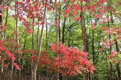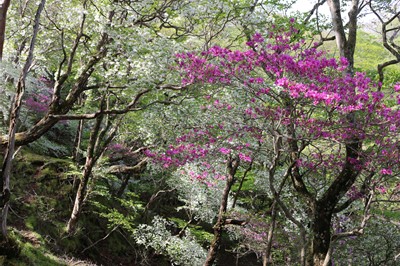 <詳細報告>4:30 に小山を出発し、6:00 に小間々駐車場に到着。既に7割程度駐車済みであった。野鳥の爽やかなコーラスが聞こえてくる中ヤマツツジのトンネルから登山開始。沢を渡ろうとすると前方崖の上から夫婦が下りてきたので待機しているとコースを間違えて戻ってきたとのこと。夫婦に出会わなかったたら間違って直進していた。(ここが桜沢右俣?)沢を抜けると新緑に包まれてヤマツツジ、シロヤシオが点在して咲いていて心が和んだ。