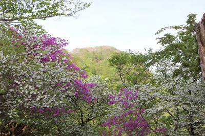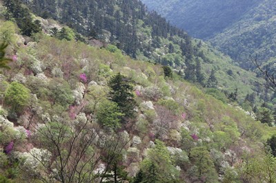大入道を過ぎると一面シロヤシオが咲き乱れていた。このような景色を初めて見たのでとても感動しました。ひなぎくさん、みつまんさんが大入道へ行くべきと推奨された意味が良く理解できました。縄文躑躅で五人組のパーティに出会う。今年は花付きが良く当たり年とのこと。剣ヶ峰でエネルギー補給のため小休止。野鳥が大好きな小6の男の子の付添いで来たという母親、スマホ片手に行先を迷っている山ガール二人組、等々人が多くなってきた。