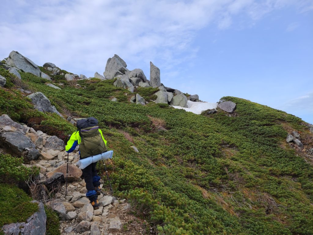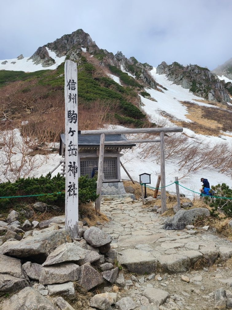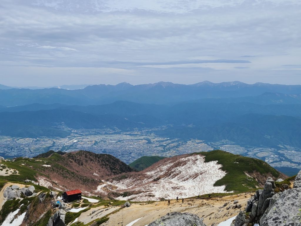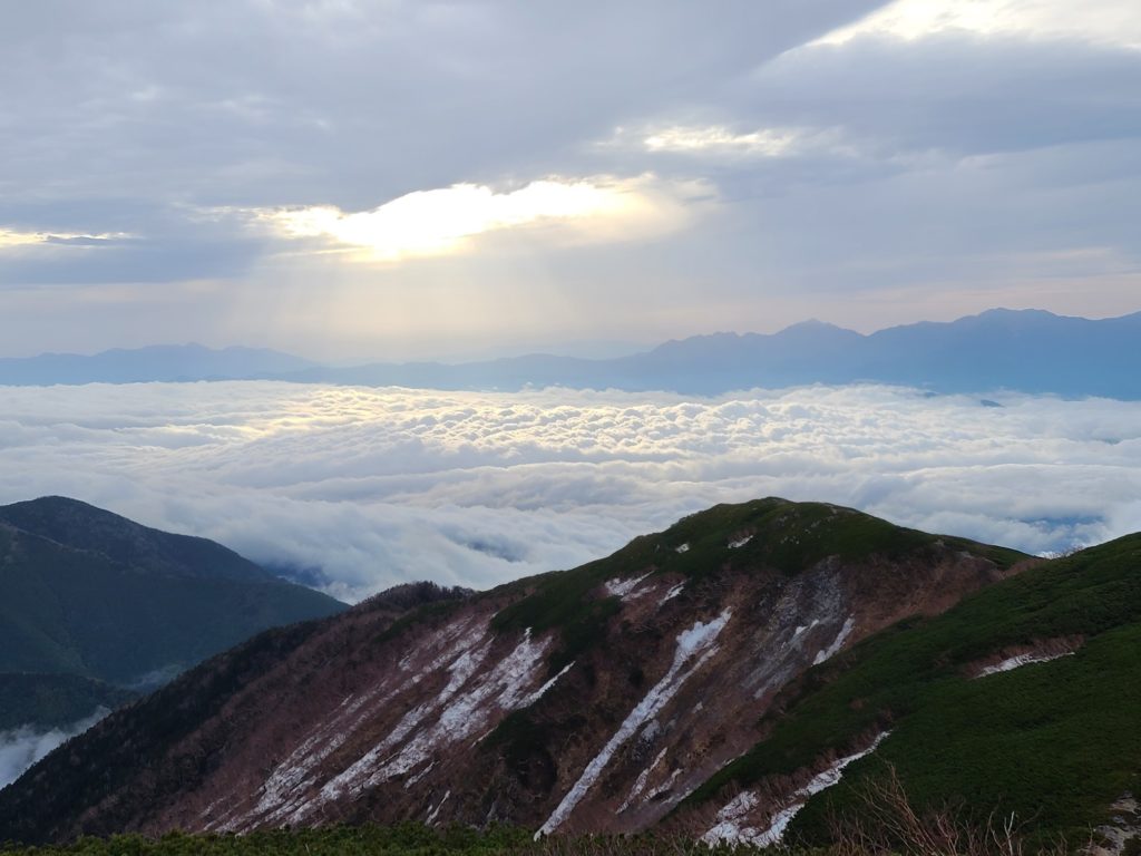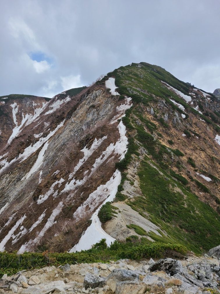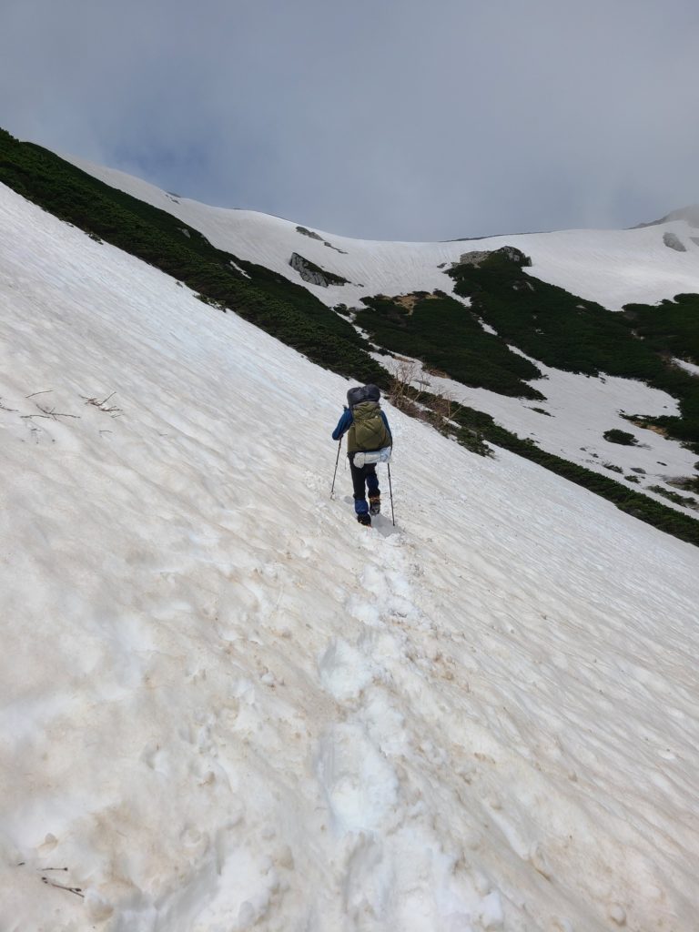 5時に田沼を出て8時半駐車場に着きました。土曜日ではありましたが雪の千畳敷の急登を登るのはハードルが高いのか駐車場は半分も埋まっていませんでした。バスロープウェイを乗り継いで千畳敷へ15年ぶり2回目です。今日の行程は4時間ほど、ゆっくり歩いても時間は余裕あります。登山届をポストに入れてスパッツをつけて出発しました。まもなく雪の急登になりアイゼンを付けました。雪はグズグズで急登とはいっても慎重にいけば全く問題はありません。30分ほどで極楽平に着きました。目の前に三ノ沢岳がドンと聳えて存在感を示しています。花の時期に行きたい山です。デポしたザックが3つありその後小屋で一緒になり三ノ沢岳へ行ってきたとのことでした。ここから気持ちの良い稜線歩きが始まります。この時期は雪に埋もれて水場がないという情報を得て水を3~4リットル背負ってのアップダウンはかなり身体に堪えました。2500越えると症状が出るやなぎさん。今回も檜尾岳手前で辛そうでした。檜尾岳までくれば目の前に小屋が見えます。山頂でゆっくりしてから向かいました。小屋には管理人さんとスタッフ2名が小屋開け準備に来ていました。玄関に入ってすぐがロフトになっていて期間外開放されているエリアです。檜の香りがするとてもきれいな小屋でした。寝床を確保し風もなく暖かいので宿泊者の皆さんと外で話しながら夕食にしました。単独で来ていた青年と百名山談議になりGWは四国の山に登ったとのこと。いつ入っていたか聞いたら私たちと全く同じ日に剣山石鎚山大山に登っていました。石鎚山は下から登ったと聞いたときアッと、すれ違った青年にロープウエイ混んでましたか?と聞かれたこと思い出しました。そのことを尋ねたら聞いたというのです。まさにその青年で奇跡的な再会にびっくりでした。小屋の管理人さんからはぜひ会の合宿で小屋を利用してくださいとのことでした。皆さんとの話も弾んでいたのですが翌朝早いので切り上げて休みました。