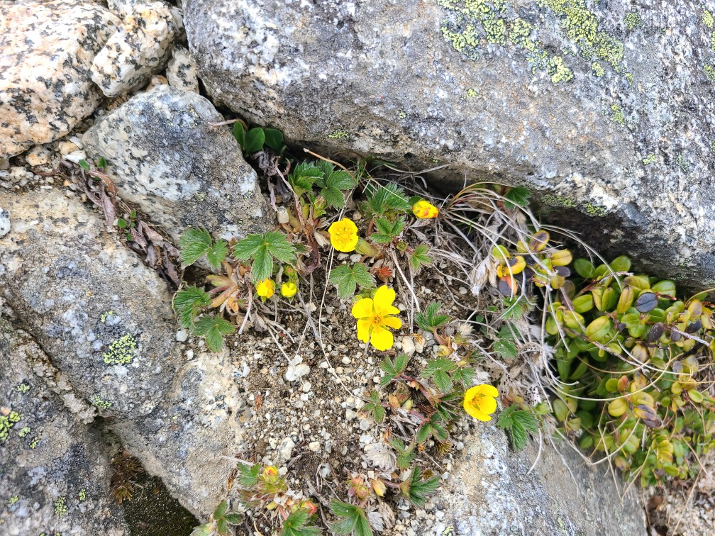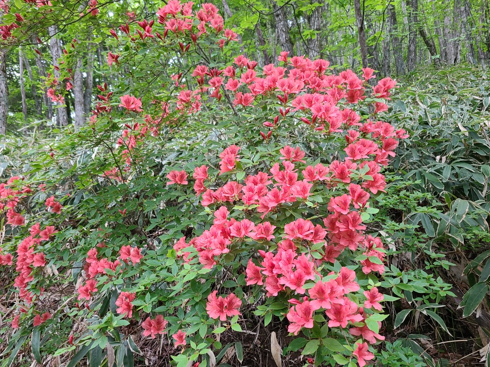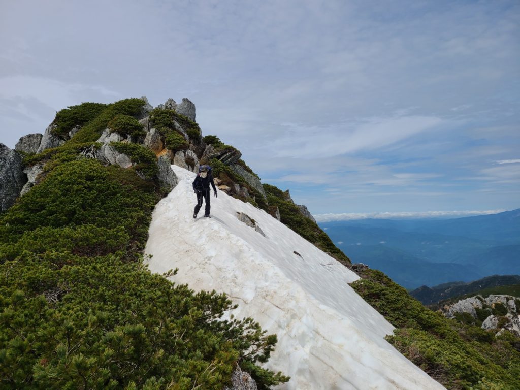 朝5時の出発予定でしたが30分遅れてしまいました。小屋の皆さんに見送られて出発。最初の熊沢岳まではつらいけど後は歩きやすいとか皆さんにいろいろアドバイスをいただいていたので安心して進むことができました。風が強かったけれど耐えられないほどではなくかえって体が冷やされバテずにすみました。アップダウンを繰り返し東川岳の激下りを降りると木曽殿小屋に到着。ラスボス空木岳の登りに備えてエネルギーを補給しました。1時間30分のCTでしたが2時間超。最後は体全身を使ってクライミングをしたり不安定な雪渓を通過したり盛りだくさん。一枚岩を登ると眼下に駒峰ヒュッテと日帰り組が下山していく姿が目に飛び込んできました。山頂は貸し切りでしたが越百から来た3人組(檜尾であった青年のフォロワーさんだそう)に写真を撮ってもらいました。360度の展望を満喫して下山開始。まだまだ余力はありました。池山尾根の下山は10キロ2200m 甲斐駒ヶ岳の黒戸尾根と同じバスロープウェイ乗り継いだ分下りるんだよなぁ、果たして持つだろうか?ヨナ沢の頭(2330m)までは踏み抜き残雪のトラバースに神経を使いマセナギ(1980m)までの下りはやせ尾根鎖場で神経を使いかなりヘロヘロになっていました。そんな中バイカオウレンの群生やイワカガミの花が疲れを癒してくれました。池山小屋分岐(1750m)へ着いたときはかなり消耗していましたが、夜から雨予報。雨に濡れるよりはということで我慢して下山するこにしました。林道終点(1361m)で佐藤さんに連絡を入れ駐車場(847m)まで500mあと一踏んばりです。日も長い時期なので明るいうちに下山できてほっとしました。駐車場近くのこまくさの湯で19時ラストオーダーのソースかつ丼にぎりぎりセ―フ間に合い、温泉で汗を流しました。同じような歩き方をしている男性がいたので尋ねたところ日帰りで聖岳に登ってきたそうです。体中が痛くて普通に歩けなくなっていました。20時半閉館で休憩もままならず追い出されるように帰路についたのでした。2日間天気よく展望を楽しみ数人しか人に会わず貸し切りの充実した稜線歩きができました。小屋での出会いは忘れられない山行の一つになりました。