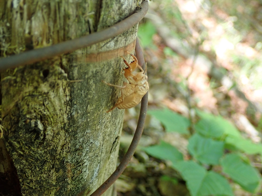 湯川に架かる橋を渡ってから登山道へ進む。鹿よけの柵をゲートを入るとバイケイソウ(コバイケイソウと区別がつきませんでしたが、帰宅後調べた)、カラマツソウの群落に迎えられた。小さな尾根を越えると、少しなだらかな山道となり、木漏れ日が爽快だった。そこにもバイケイソウが多く、そのなかにルイヨウボタンを見ることもできる。エゾハルゼミの合唱が脳の髄まで響いた。私は初めてこの季節に日光の山を歩いた時に必死になってカエルを探したのを思いだした。こなっち2さんがセミの抜け殻を見つける。まもなく、斜面北側を登り始める。少し登るととシロヤシオが咲いていたが、落花が多いのが気になる。尾根に到着。尾根を進むとシロヤシオの群落が始まるが、大部分はすでに落花していた。おとといの大雨の影響らしい。でも、健気に残ってくれている花もあって、それなりにシロヤシオを楽しむことができる。時々左手に中禅寺湖を眺められる場所があり、右手には外山がちらっと見えた。シャクナゲも期待していたのだが、それは完全に花の時期を過ぎていた。