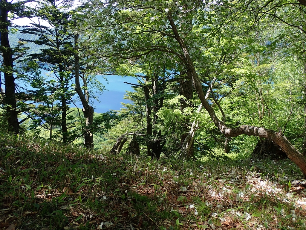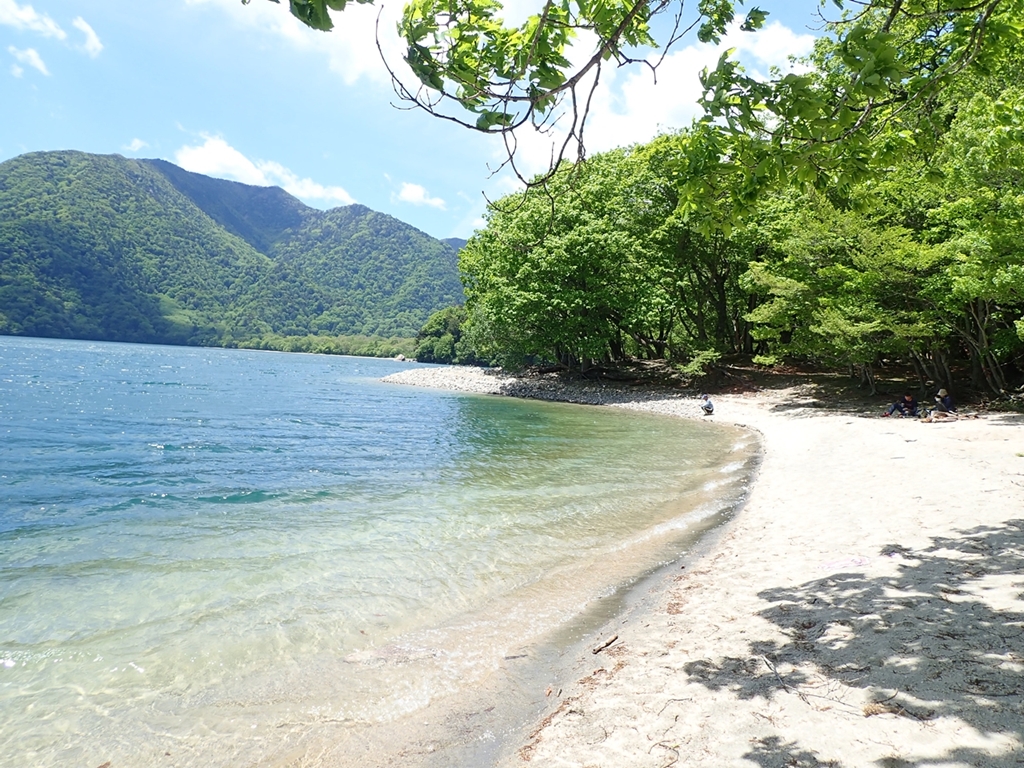 休憩後、山頂から西に下るが、シロヤシオは西側が多い。4-5日前なら感嘆の声をあげたことだろう。少し下ったところで、ヤマツツジとシロヤシオが咲き誇っている場所があった。この山にはミツバツツジは少ないようだ。その横に中禅寺湖を見下ろせる場所があり、湖とシロヤシオを上手くワンショットにおさめようと俄かカメラマン達が腕を競った。西側の急斜面を30分程下ると、熊窪・小田代ヶ原の分岐に到着した。そこから南へ下る。歩きやすい山道で、脇にはたくさんのクワガタソウが小さなピンクの花を咲かせていた。他にも花はまだ咲いていないが葉に特徴のあるサワギク、黄色い花のヘビイチゴをたくさん見た。湖岸に降りて来た。白砂、澄んだ湖水、緑の山脈、晴天。見事なコラボだ。