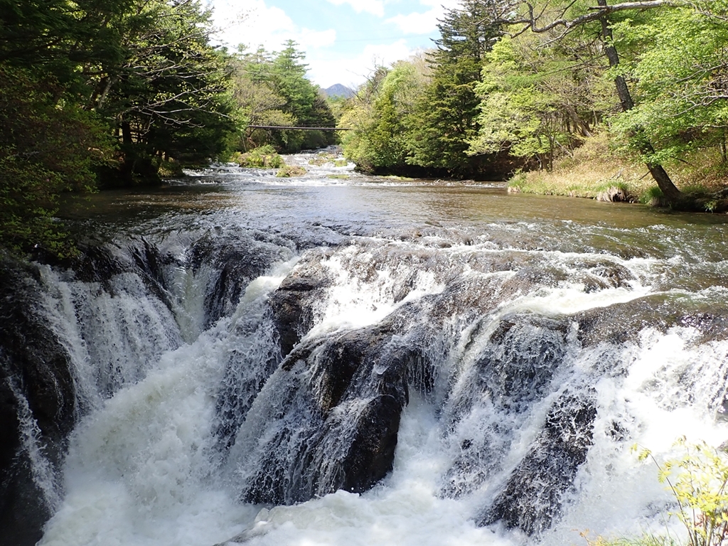 しゃくなげ橋から湯川沿いに緩やかに下る。途中、「ナイアガラの滝」の超小型版、「吹割の滝」の小型版が数か所あり、楽しむことができた。そこに、咲き誇っているミツバツツジを見たが、本数は少し。
