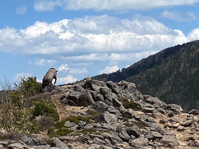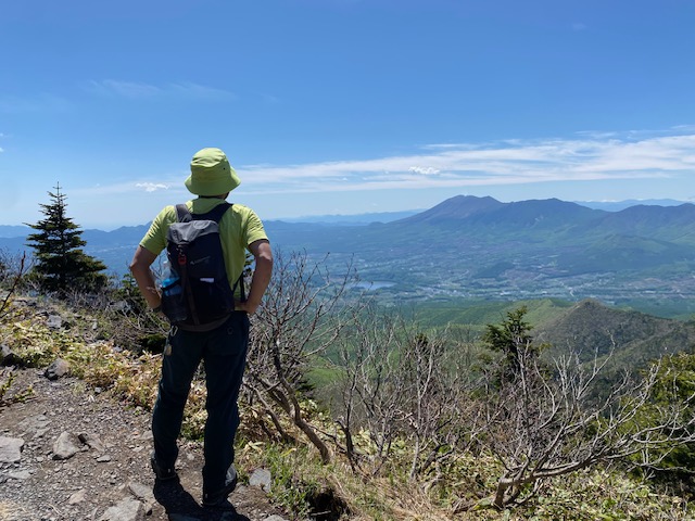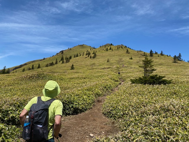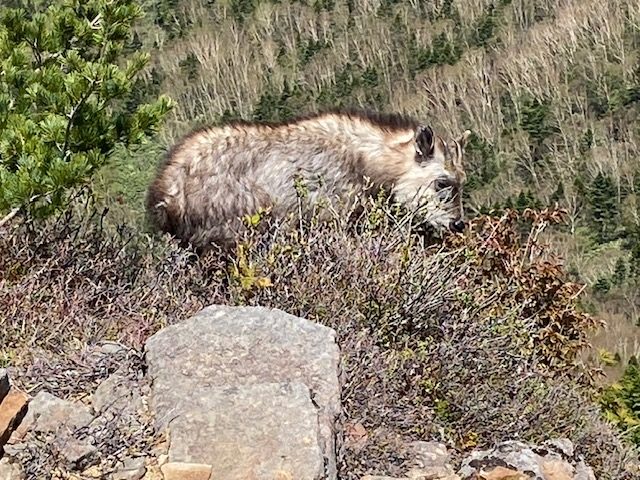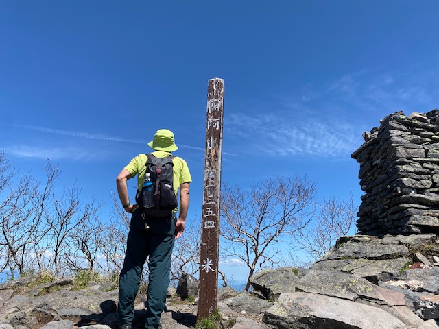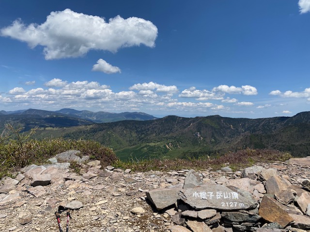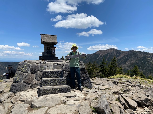 <詳細報告>小山を4時に出発、バラギ温泉駐車場には6時20分到着。私たちの車しかいなかったが、10分後にもう一台停車して、「四阿山に行くのかな」と聞かれたので「ハイそうです」と答えると、「一緒だな」と言ってすぐ歩き出した。我々は後からその年配の方を車道で追い抜いた。樹林の中、登山道は一部川のようになっており、ヘリを歩くのに難儀した。渡渉が数回あり、増水しているので、一度足を滑らせて片足を沢の中に突っ込んだが、幸い靴の中には水が入らなかった。連れの一人も足を突っ込んだが、そのうちに乾いてしまった。しばらく樹林の中を進み、茨木山の手前から急登になって、山頂に着くも全く展望なし。ここから90度折れ曲がり、四阿山を目指す。高度を上げてゆくとようやく周囲の景色が見えるようになり、浅間山からの噴煙が見え、連れの二人は感動していた。四阿山の稜線に出ると細い稜線では両側に絶景が広がった。後立山連峰、常念山脈、槍の穂先、富士山も見えて、素晴らしい。山頂近辺までははじめに抜いた年配のソロのかた、下山してきた中年のソロの方、たったの2人しか会わなかったが、山頂にはかなりの人数の登山者がいた。混んでいたので写真を撮ってすぐに根子岳方面に向かった。かなり急坂を下り、コルに出ると根子岳の裾野に広がる竹の低い笹と低い樹林の間を縫うような登山道が一望でき、緑色が眩しかった。山頂手前の岩場で見晴らしが良いのでお昼休憩とした。飲み干す一杯シリーズの坦々麺とサンドイッチ、コーヒーで、3人で岩の上に座って食べていると、通りがかりの人が「いいところで食べてますねえ」と声をかけてきたので、「はい」と答えると、次の通りがかりのパーティーも「すごくいいですねえ」と声をかけてきた。場所選定には自信がついた(笑)。根子岳に着くとここもわんさか登山者がおり、鐘を鳴らして写真を撮ってすぐ小根子岳に向かう。山頂からは菅平牧場や光るビニールハウスの群れや北アルプスが一望でき、穴場スポットであった。登山道はザレ場もあるが、整備されており歩きやすかった。ピストンで降りてくる途中、また浅間山を見たが、この時は噴煙は見えなかった。景色がよく見えるこのルートは菅平からの周回よりもオススメだが距離が長く、渡渉があるのでツウ好みであろう。岩場で至近距離でニホンカモシカと遭遇した。近づいても全く動じず、この山の主と見た。こんなに接近できたのは初めてであった。その後長い下りと渡渉をしてバラギ温泉には16時過ぎに着いた。バラギ温泉はモンベルカード提示で400円、客は少なく浴槽は大きく、出てきてからノンアルコールビールがなんと200円で安い。17時30分にバラギ温泉を出発し、小山には20時ピッタシに到着した。3回めの四阿山であったが、晴れて全貌が見えたのは初めてであった。