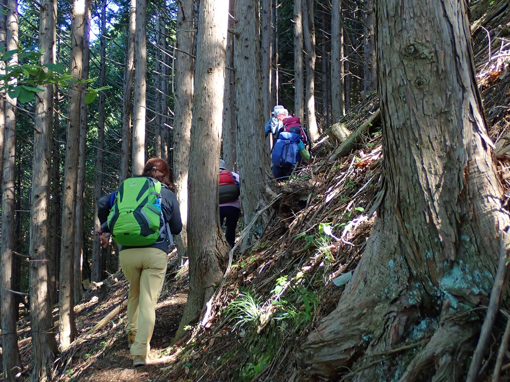 登山道は東電鉄塔巡視路を辿っている。植林地内の急斜面をジグザグに上っていく。谷側は急斜面で転倒するとどこまで転がるかわからない。20分程登って尾根に着くと少し傾斜が緩んだ。この山では春にはイワウチワが楽しめるという。今は鮮やかな葉が残っているだけで、一部に花柱が残こり実が付いていた。ドウダンツツジが咲いていた。その先で耳のような大きなこぶの付いた木があった。この尾根の西側は一部絶壁になっていて、崩落が登山道のすぐ横まで迫っていた。