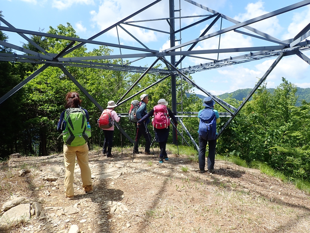 登山口から約90分で山頂に着いた。山頂は広いが展望はない。見上げると新緑と青空が眩しかった。いくつかの山名板がぶら下がっていたが、初めて見る手の込んだものもあった。少し休んで、下山開始。山頂からは南東の尾根を17号鉄塔経由で下る踏み跡もあるようだが、登って来た道を戻る。