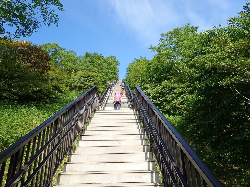 最初は1445段の天空階段だ。ニッコウキスゲは咲いているものもあるが、まだ本数は少ない。見頃にはまだ早かったようだ。笹原にはカラマツソウの白い花が目立った。階段にはサラサドウダンツツジの落花が積もっている場所もある。ひと汗かいて階段最上の展望台に上った。正面に「たかはら」の山々が見事だった。
