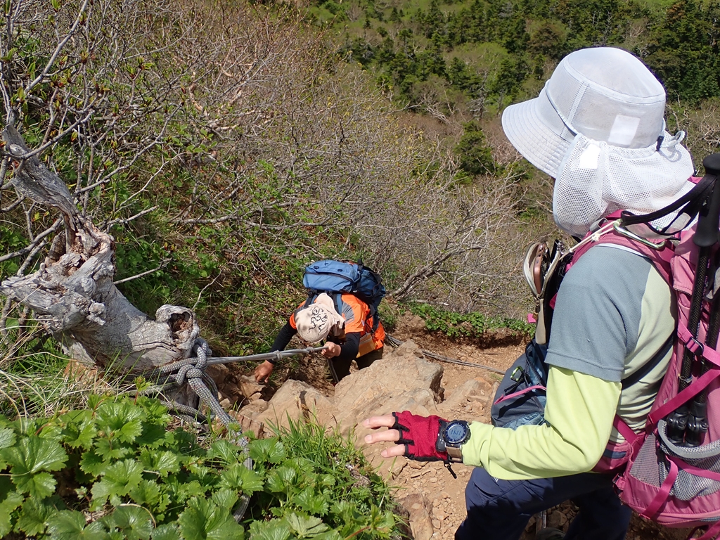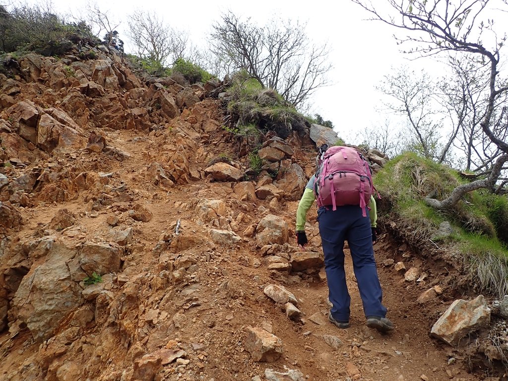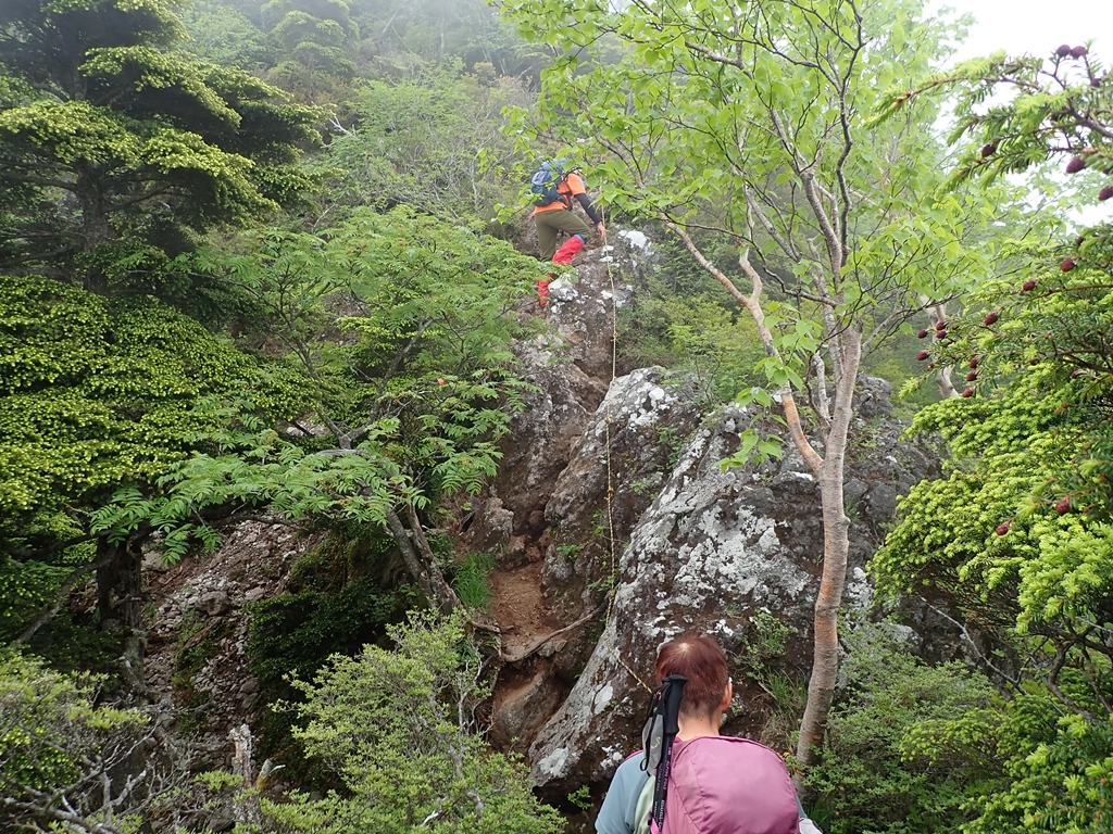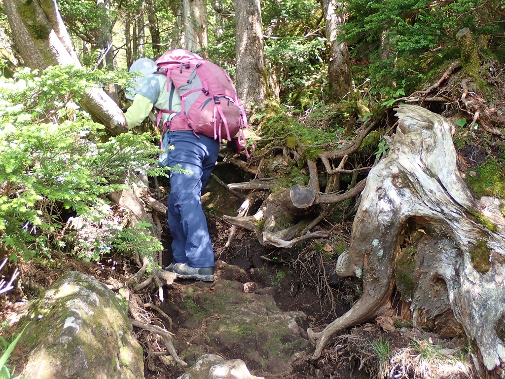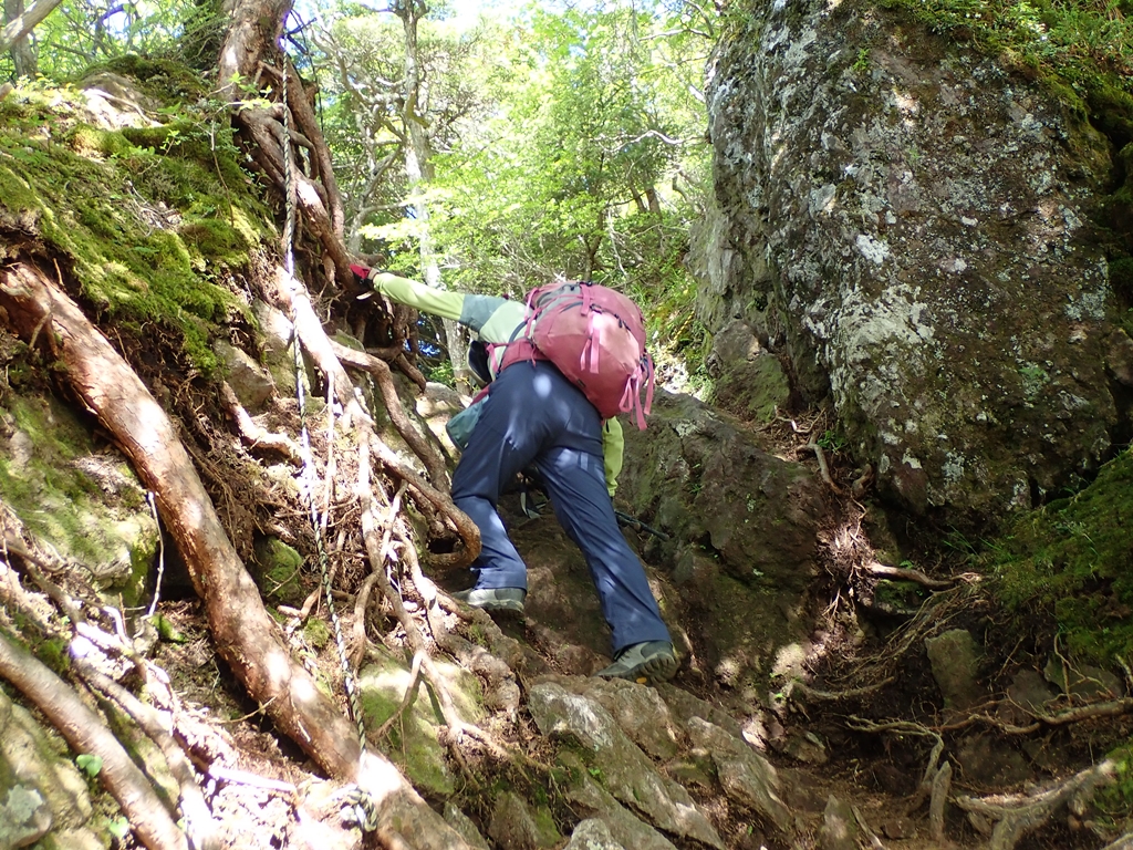 下山開始。2390m辺りの崖はロープに掴まって下るが、その支点は枯れ株で心許ない。岩は赤土が固まったものですぐ崩壊しそうだ。ゆっくりと慎重に下る。水場手前で左足に軽い痙攣が発生。水場で再度芍薬甘草をのんだ。これを2回服用するのは久しぶりだ。