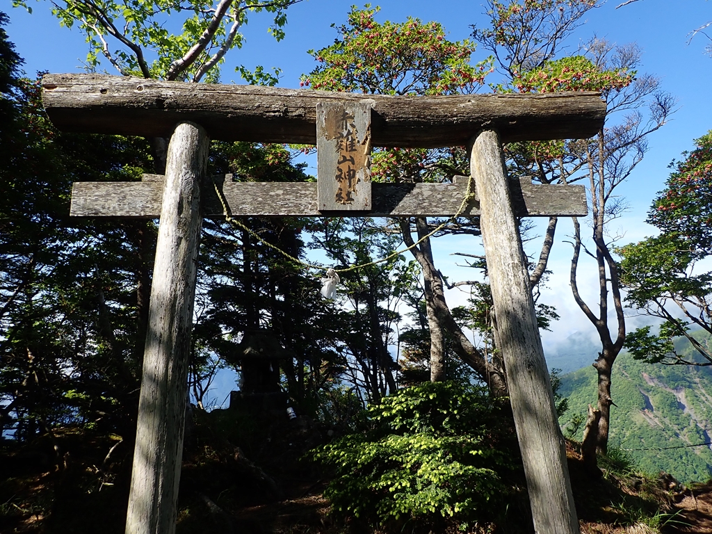 そこからひと登りで、動物避けの回転扉をくぐると小丸山の標識がある。麓からみると山にみえるのだろうが、実際は尾根の「肩」である。そこから見る赤薙山は素晴らしい。笹尾根の先に聳えている姿を見ると登りたくなる人も多いだろう。だが、見た目と実際は大違いで、笹尾根は石が多くて歩きづらいし、その先の樹林帯の下は大きく抉られて根がむき出しになり、段差も大きいので疲れが増幅される。踏み跡はあちこちにあるので、適当に楽そうな場所を選んで登るが、外れて溜息が出ることもある。赤薙山山頂に着いた。神社が祀られているので、手を合わせて山に入らせてもらうことを祈願する。