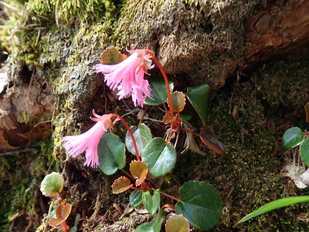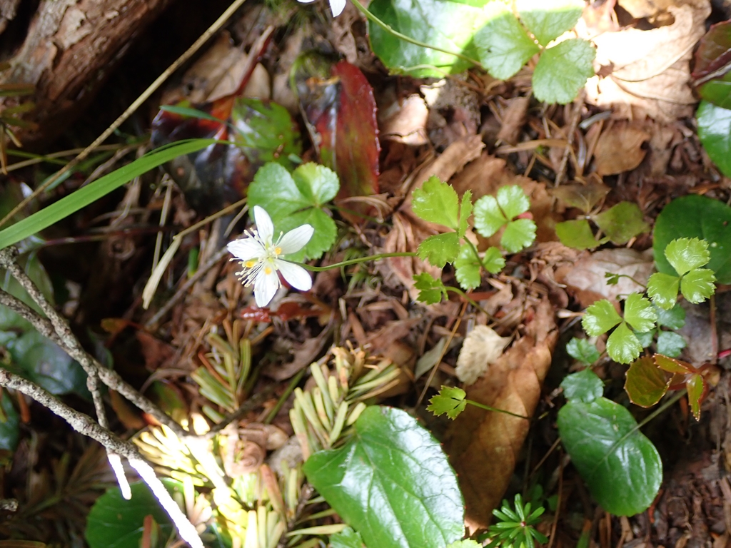 赤薙山から奥社跡までは悪場が続く。小さなアップダウンが多い険しい尾根だが、小さな花がたくさん見られた。とりわけコイワカガミが多く、赤薙山寄りは白花の領域だが、奥社が近づくと赤花に切り替わる。最初は花に力がなかったミツバオウレンも次第にしっかりしてきた。赤薙山から50分で奥社跡に着いた。