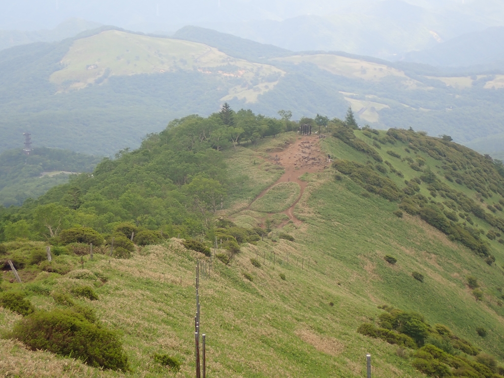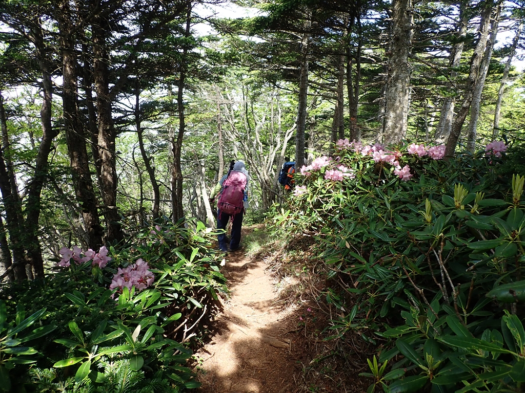 奥社跡から一旦下って尾根に登ると「ヤハズ」で、歩きやすい尾根となる。シャクナゲが残っていた。やがて見晴らしの良い「一里ヶ曽根」に到着するのだが、人の記憶はあてにならないものだ。私が12年前にここを歩いた時の印象としては、「ヤハズ」からすぐ「一里ヶ曽根」に着いたような気がする。そして、「一里ヶ曽根」の岩峰はもっと広かったような気がする。12年で樹林帯が西に広がったとは考えにくいのでやはり勘違いなのだろう。岩峰からは尾瀬の山々がはっきり見えたが、会津駒ヶ岳から右側は雲に隠れていた。日光側はガスの中だ。