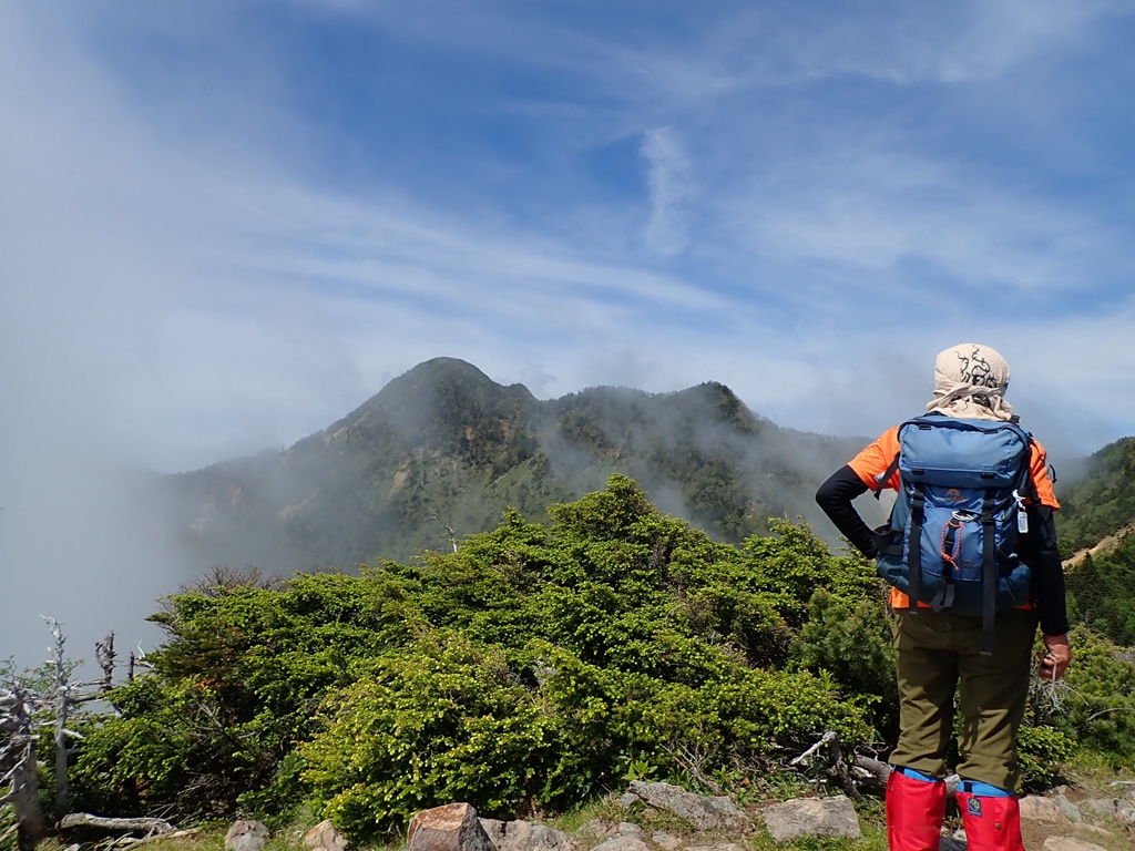その先はハイマツ帯となるが、12年前は松に足元を取られたが今回はきれいに整備されていた。その正否は分からないが、登山者にとって安全であることは確かだ。山頂手前の三角点はハイマツに隠れていた。