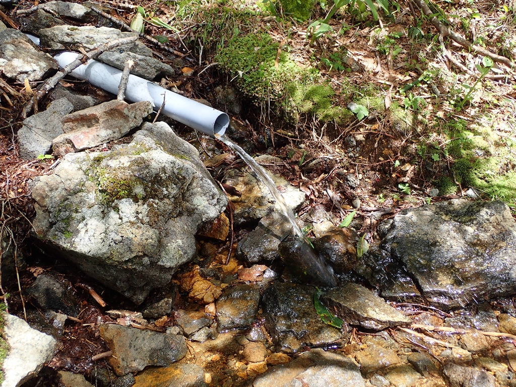 一休みして、ガレ場を用心して下れば水場の標識がある。水は勢いよく出ていた。水場でコースタイムを割り込むようだとそこで折り返す予定だったが、そこまでで約30分の余裕ができた。女峰山まで行くことにした。