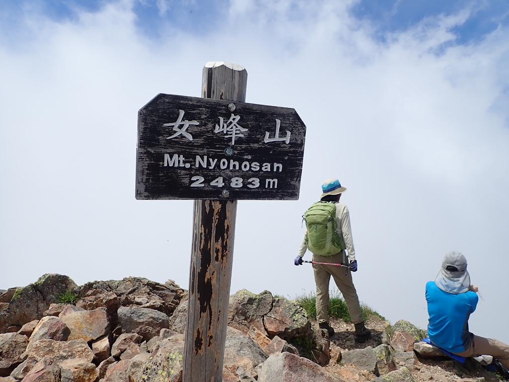 女峰山山頂に到着。山頂標識の岩峰には4-5人が休んでいた。シャッターをお願いして標識前で記念撮影を取る。山頂からは尾瀬の山々がはっきりと見えた。燧ヶ岳の双耳峰と会津駒ヶ岳のなだらかな山容はすぐ特定できるが他の山々の特定は難しい。神社前で大休止。私は下山に備えて芍薬甘草をのむ。