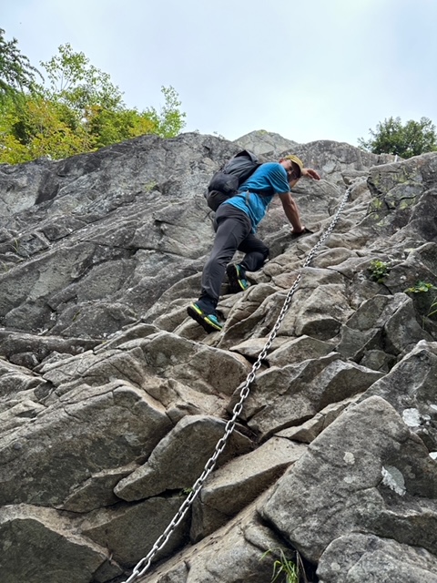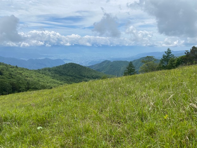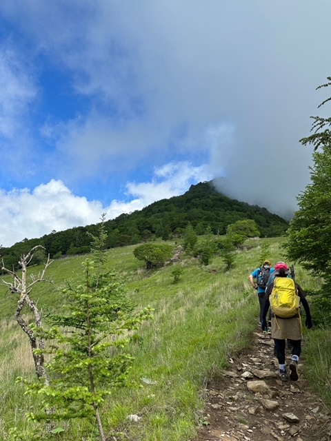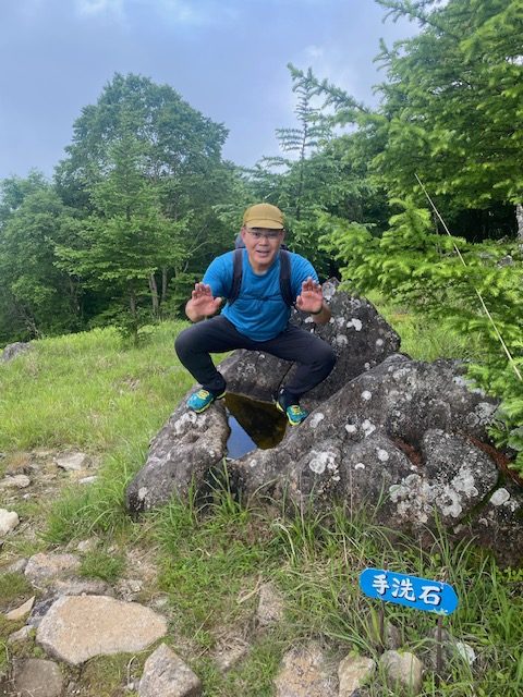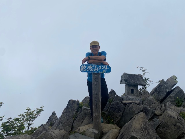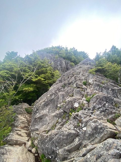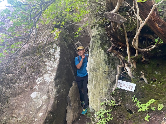 <詳細報告>小山を3時30分に出発、乾徳山駐車場には6時15分頃到着した。駐車場は半分以上は車あり。準備を整えて道満山を目指す。歩きやすい登山道ではあるが、蒸し暑さのためみな汗の量が半端ない。九十九折りの道の途中で、1名が気持ち悪いと訴えあり、しばらく休憩した。おそらく熱中症と判断し、水分補給して良くなったというので、スピードをかなり遅くして歩行再開。道満山は見晴らしなし。しばらくは樹林帯の蒸し暑い中の登りが続き、しかもガスなので嫌なムードになってきていたが、月見岩のある原っぱに出ると気分も変わった。手洗い岩なるものがあり、手を洗う流し台の形なのか、お手洗いの便器の形なのか区別がつかなかった。しばらくゆくとまた樹林帯に入った。そのうちに髭剃岩、胎内などあり、岩場の鎖、ハシゴが登場した。濡れてはいないので、思ったほど怖くなく皆問題なく通過した。最後の岩場が鎖が長く、一人ずつ慎重に登った。あまり恐怖を訴えることもなく淡々とのぼり、山頂へ。ガスで周囲はほとんど見えない。しばらく待ったが、ガスは消えないので、下山開始。迂回路を使用したが、その後は1本しか道がなく、登りと下りのパーティで譲り合い、下山してゆく。途中団体さんなど、多くのハイカーが登ってきたので、岩場での長い渋滞が予想された。朝のうちに通過してしまって本当に良かった。トイレを我慢していたので、避難小屋に到着してホッとしたが、大用は男女共通で1つしかなく、しかも鍵かからないトイレであった。私の前に違うパーティの2名の女子がおり、お先にどうぞと言って待っていた。自分の番になって入って出てくると鹿の群れがおり、むしゃむしゃ草を食べていた。しばらく沢沿いをおり登山口へあっという間だった。時間があったので、徳和渓谷に滝を見に行くことになり、遊歩道を降りて、沢の淵で昼食とした。昼食後駐車場に向かうと、第2駐車所というか新しい駐車場も満車であった。中央高速が混むのを避けるために、温泉には入らずに小山に直帰した。