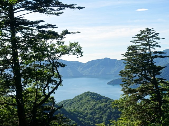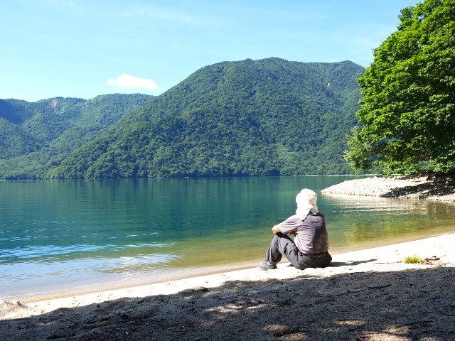 珍しく若者1人が追い付いてきました。聞けば高山のあと、切込湖、刈込湖を歩くという、さすがに若さは凄い、あっというまの早歩きにはビックリです。登りではさすがに汗もでるが、終日木陰の下で助かる。ちいさなアップダウンを繰り返し、やがて山頂着、未だ7:30だ。腹を満たして下りにかかる。西側斜面は歩きづらい岩混じりが目立つ、冬来た時には、凍った斜面がアイゼンの歯が立たず、ピッケルが欲しかったことが思い出される。小田代原との分岐まで降りた。あとは南への緩斜面を歩いて熊窪だ。中禅寺湖のほとりでノンビリし、あとは湖畔歩きだ。