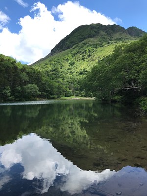 弥陀ヶ池に到着し池越しに奥白根山が見える休憩所が立入禁止となっていたので木道を進み池の南側のベンチで小休止する。