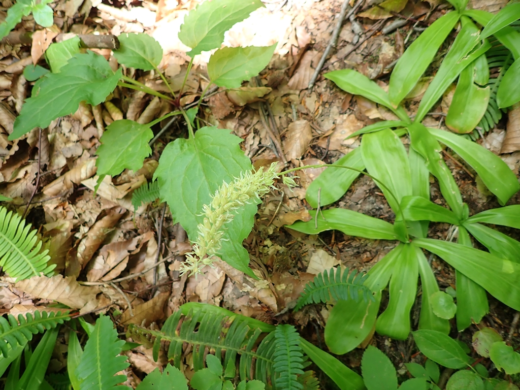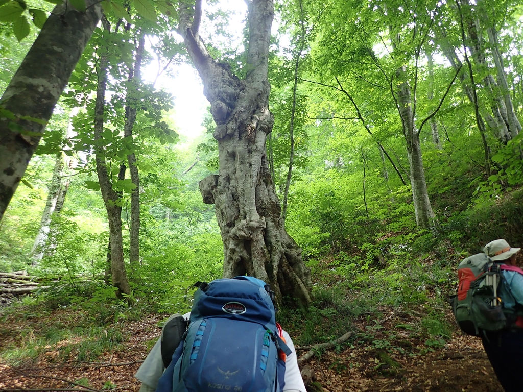 歩き始めは樹林帯内の林道で最初から蒸し暑い。御沢登山口から山道になるが、傾斜もでてきて汗だくになった。登山道脇には春に見事な花をつけたであろうイワカガミの葉が輝いていた。そして、見慣れないランの花が見られた。葉はツバメオモトに似ているが花が違う。帰宅後調べると「ノギラン」らしい。ラン科ではなくキンコウカ科だという。この花はこの尾根の上のほうまで見ることができた。花以外ではブナの大木が多く見られた。下十五里で一休み。また、中十五里で休んでいると、3人グループが下りてきた。山口県からやってきたという。シラネアオイを見て感激したと言っていた。