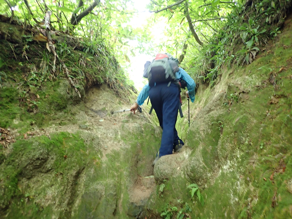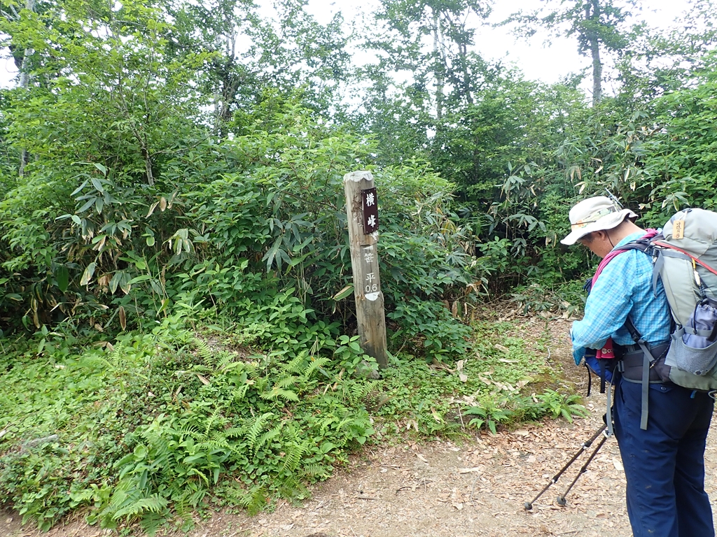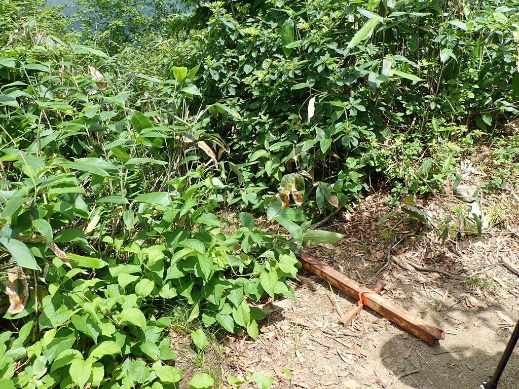 そこからも大きく掘り込んだ登山道を汗だらけになりながら登って行った。くりさんが笹平で休んでいる間に横峰の先まで登って折り返した。前回は上十五里で折り返しているので今回は随分と頑張ったことになる。ところで、横峰の先にクワノ沢からのショートカットコースがあったらしいが、その道は踏み跡は残っているが草木で覆われて一般登山道ではなくなっていた。新しい「山と高原地図」では「緊急時の作業道」という表示になっている。
