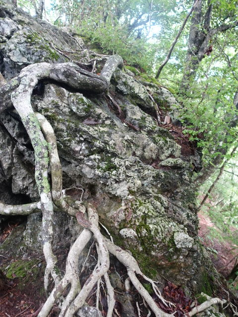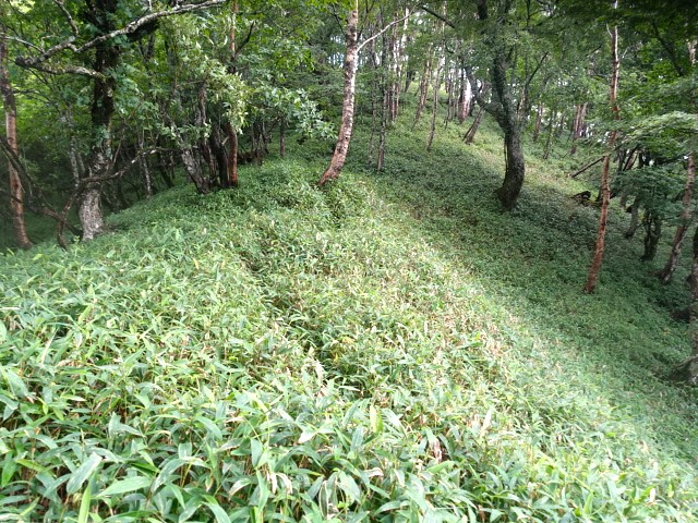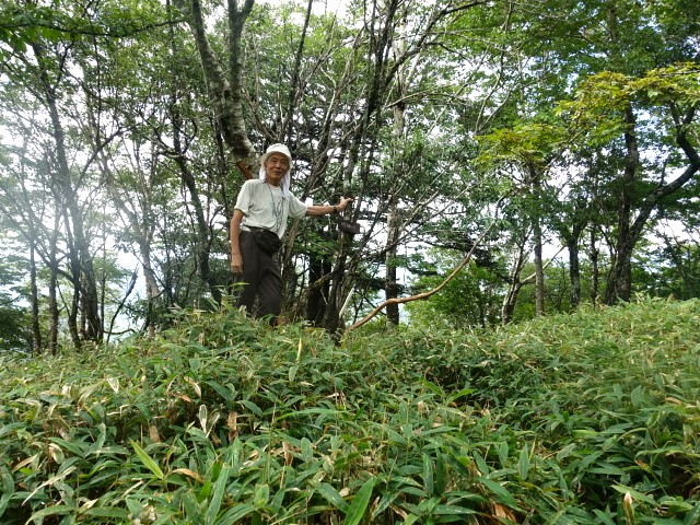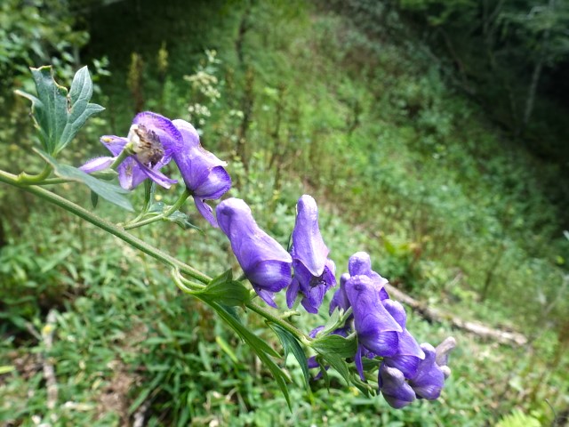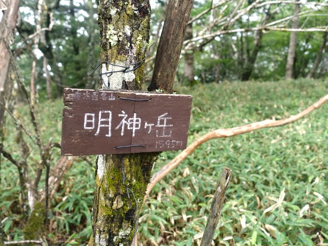 いきなりの急登、1050mのピークまで急登が続く。ピークを過ぎると、小さなアップダウンの繰り返し、1159p 1361p を過ぎ、1345pから東に方向を変え明神への登りだ。途中、シャクナゲが可なり多くあるが、咲いた気配はない。山頂への鞍部にトリカブトが沢山あったが、咲いているのはほんの一部、一帯はミヤコザサの急登になる。笹が濡れていて膝下がビッショリになる。山頂(1,594m)までの笹の急登はかなりきつかった。