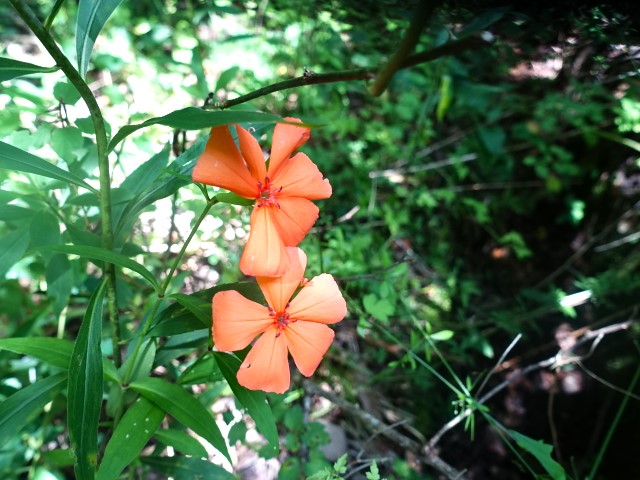 誰も居ない静かな山頂でノンビリし、いよいよ下山、足元がハッキリしないので細心の注意で下る。ケモノの気配は感じるため、鈴は勿論、時々笛を吹き注意する。人の気配は全くなし。心配の気温は21~22℃、汗はかくが、木の陰歩きで暑さは気にならない。ヘロヘロになって林道へ降りた、あとは駐車場まで一頑張り。途中、珍しい花が咲いていた、むかし、沢歩きの時に見かけた花だ。フシグロセンノウだ、一輪だけどホットする。トンネルだらけ(9ケ所)の道路を走り、湯西川道の駅で汗を流した。連休とあって、人出と車がハンパでない。