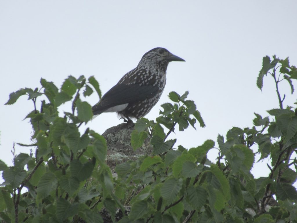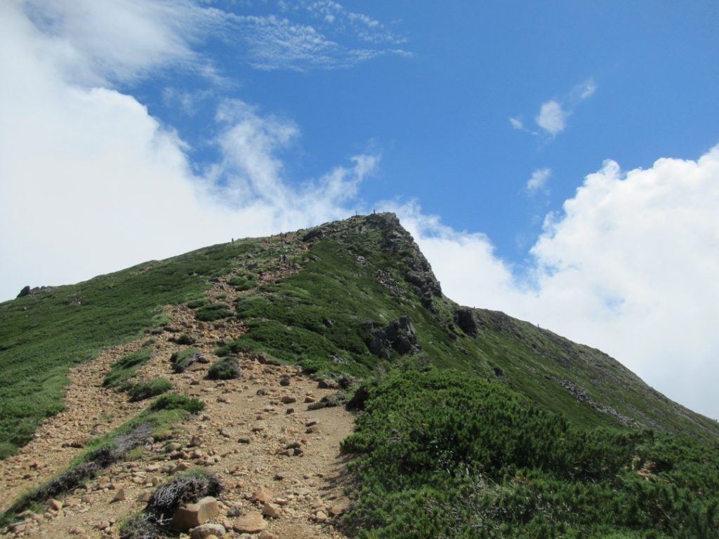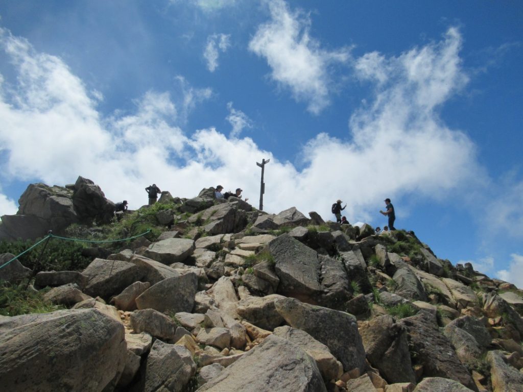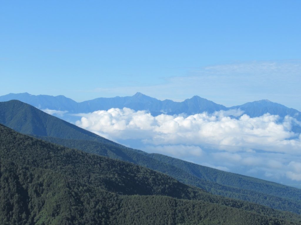 明るくなるのを待ち5:30に西尾根登山口を出発し、針葉樹の樹林帯を500m程登り第一展望台に到着しました。天気は良く、雲海の上に、南、北、中央アルプス、八ヶ岳連峰がすっきりと見渡せます。歩を進め第二展望台、山頂直下の岩場を登り、西天狗岳に到着、360度の眺望を楽しみ東天狗岳に向かいます。10時頃から早くもガスが沸き上がり始め眺望もここまで、天狗の奥庭を経由し黒百合ヒュッテに下りますが、1時間程大きな石だらけの歩きにくい道が続き、嫌気が差してきます。ホシガラスと初秋の花に出会えたことと、気温15℃と涼しかったのが救いでしょうか?黒百合ヒュッテから唐沢鉱泉に向かう沢沿いのルートも大きな滑り易い石だらけ、このコースはうんざりです。