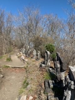 登山口は何コースかあるが、今日が初めての水沢山登山なので、坂東16番霊場水澤観音堂内を通り、観音堂で登山の安全を祈願し登山口に向かった。観音堂の左手の急な石段(73段)を登る。所々に標識が立っているので迷うことは無い。途中に熊出没注意書きがあったので、熊鈴を身に付けた。所々で花たちに癒されながら歩いたが、花は少ない。登山道は整備されていて歩きやすい。渋川市が材料を支給し、ボランティアの方が維持、管理に努めておられるとの事でした。暫くして下山者に会いだした。早い方は、5時前には登り始めるそうだ。お休み石で小休止。この先から急登だが、登山道に咲く花に癒され、元気を貰い展望が開ける場所までのんびりと歩いた。展望の開けた所には12体の石仏が横並びしていた。南側は遮るものがない為 、関東平野が一望できた。ここから先の400m程は、なだらかな稜線歩きで気持ちが良かった。