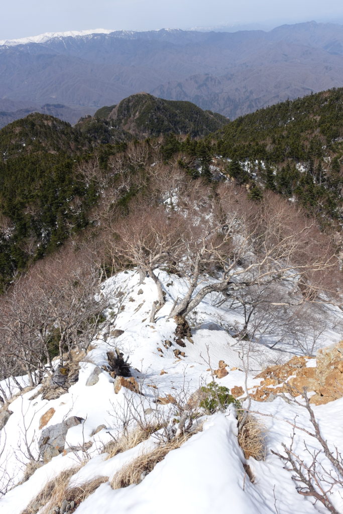 名物の階段登りで心拍が上がり、その後も傾斜がきつい登山道をゆっくりと登り続け、赤薙山への登り手前で小休止。赤薙山までは雪無しでしたが、奥社跡(標高2200m )からはほぼ雪道。日陰で硬い雪のところもあり、簡易スパイクを着用して歩きました。足回りはゴアテックスのトレランシューズ。これに六本爪、チェーンアイゼン、簡易スパイクのどれを合わせるか検討し、ほどほどの効き具合と着脱の容易さの観点から、簡易スパイクを選んでいます。登り下り15名程度の登山者と交差しましたが、六本爪、チェーンアイゼン、稀に十二本爪、アイゼン無しと皆それぞれの足元でした。アイゼン無しでも登れるかもしれないが、何らかすべり止めがあった方が足元の滑りが抑えられるので歩くのは早いと思います。