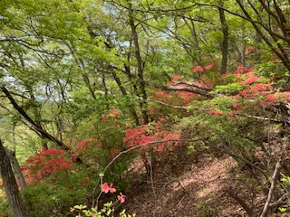 仙人ガ岳は、ヤセ尾根と露岩混じりの小ピークのアップダウン、クサリが付けられた少々高度感のある犬返しの岩場など、低山のハイキングコースとは思えないくらい、変化に富んだ尾根歩きが楽しめた。ヤセ尾根から望む松田ダムや左右の尾根からの山並の眺めがとても良かった。そしてヤセ尾根両側に咲いていた山ツツジ、アカヤシオ、あおだも(白い)に癒された。あおだもの木が多く、満開で綺麗だった。土曜日ということもあってか、50人程が入山していた。