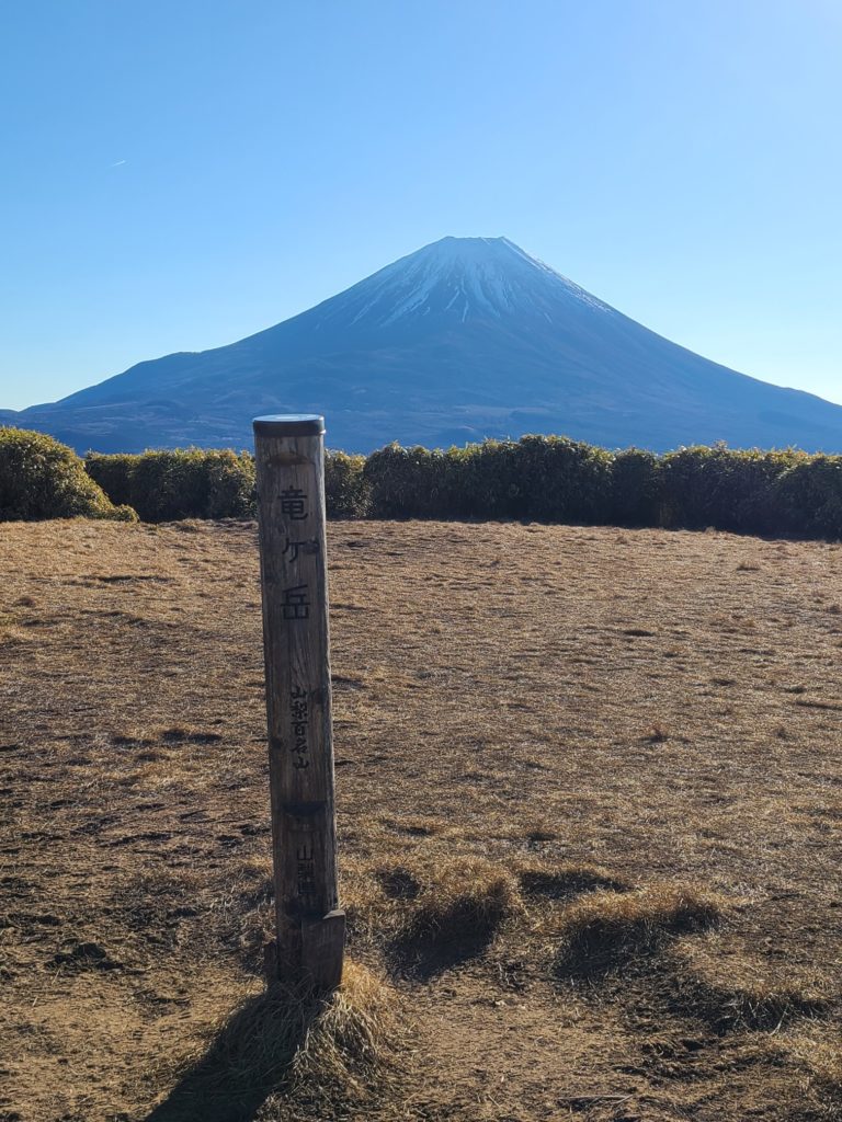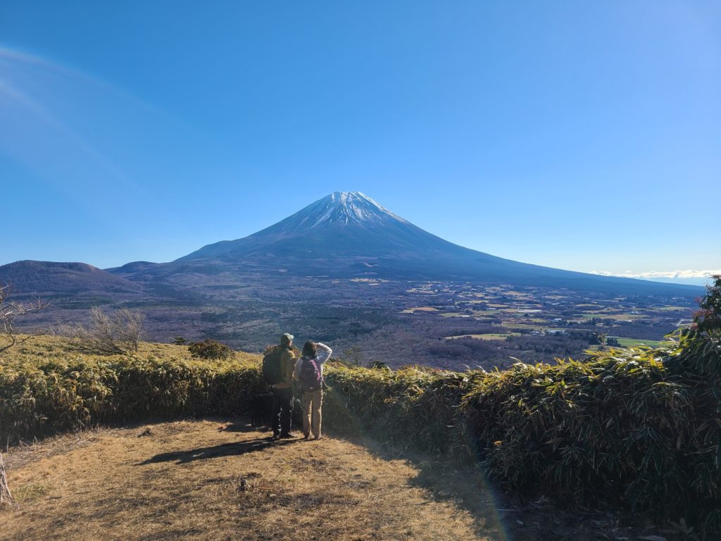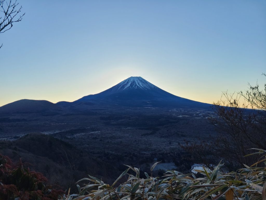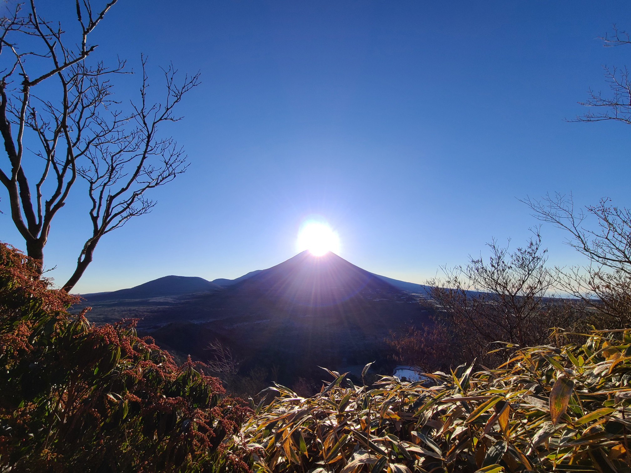 ダイヤモンド富士を見たいというメンバーを案内しました。前回は日の出まで30分ほど寒い思いをしたので今回はツエルトを被って待ちました。ツエルトのありがたさを実感。同じ場所に89歳のおじいさんが待っていました。毎年来ていて来年は辰年なので竜ヶ岳のダイヤモンド富士の写真を年賀状で送ると話していました。先週は赤城山に行ったそうでお元気でした。ほぼほぼ真ん中に上がったダイヤモンド富士の写真を何枚もカメラに収め山頂に向かいました。多くの下山してくる人たちとすれ違い皆さん山頂で日の出を見てきたようです。ほとんど下山されていて山頂はすいていました。ベンチで休憩していると隣に座った3人組のおじさま方の会話、なんかなじみのあるイントネーション。お話しすると宇都宮の方でした。やっぱり…朝4時半に出たのでダイヤモンド富士は見られなかったけど、富士山眺める山行をしているので今日は最高と話していました。周回の予定でしたが下山コースは展望もないので富士山を見ながら降りることにしました。霜が溶けて登山靴が泥んこになりました。下山後ほうとうを食べて温まり渋滞回避で早めに帰路につきました。