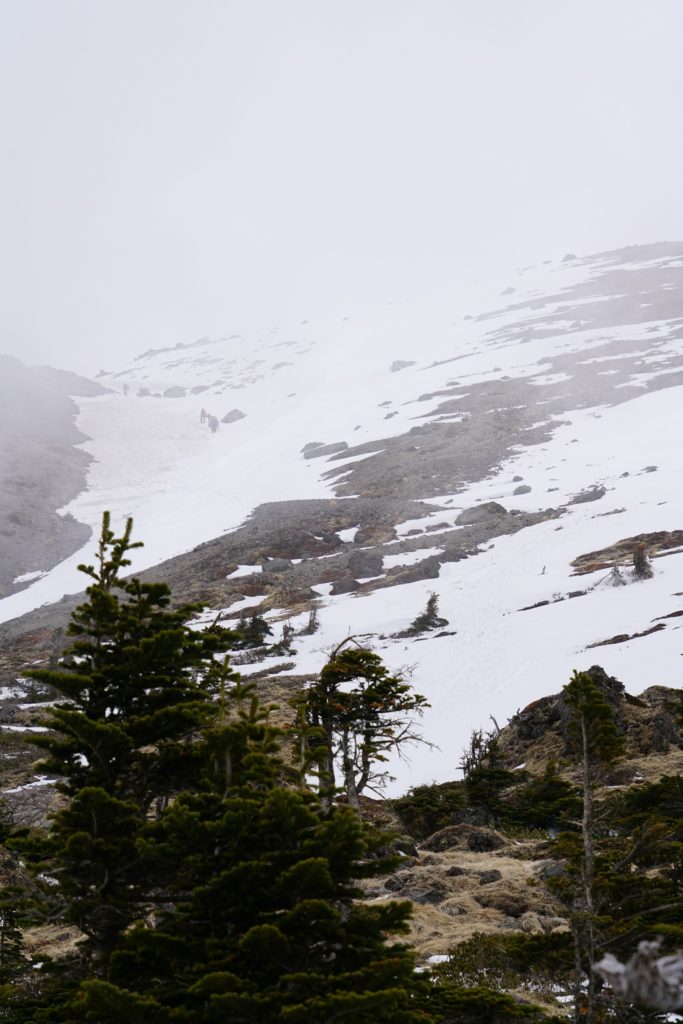 斜が出てきたのでアイゼンを付ける。斜面を巻くようにして進み、少し急坂を登り山
