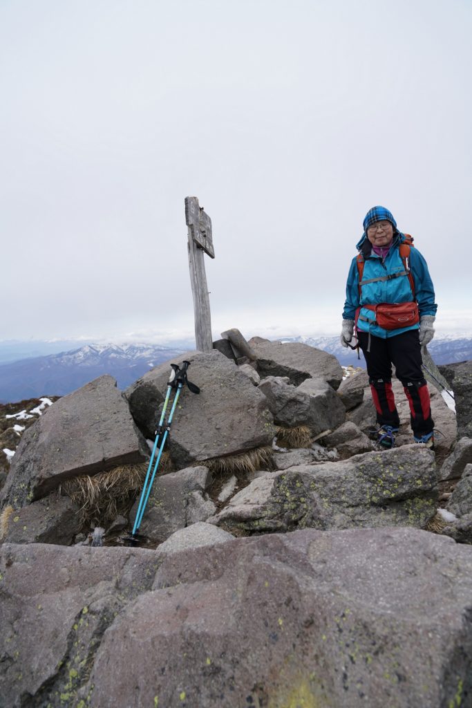 頂へ、途中ガスが出てきたが、予報通りで昼頃には回復して視界がきくようになっ