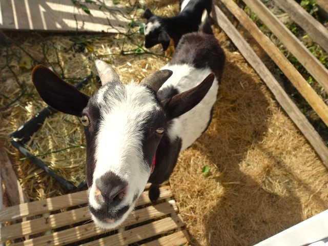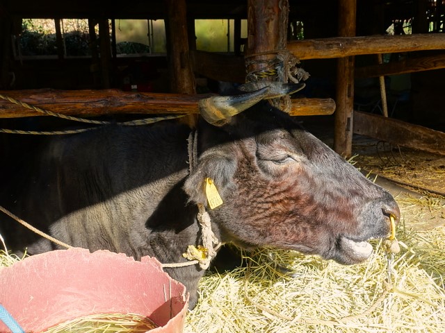 地形図には道路があり駐車場へ最短で行ける周回道路に見えるが、坂を上った上にあるケーキ工房(牧場café)まで行き主人が言うには、駐車場へのルートは崖が酷く崩れ全く通れないと言う。仕方ない、朝通った藪混じりの人骨山へのルートをまた通ることになってしまった。ヤギの親子にお別れし踏み跡薄いトラバース路を苦労しながら戻り駐車場に無事帰還。思わぬ状況となってしまった。