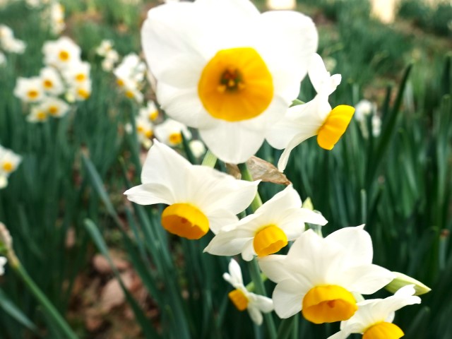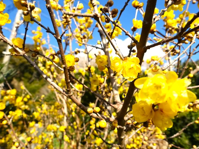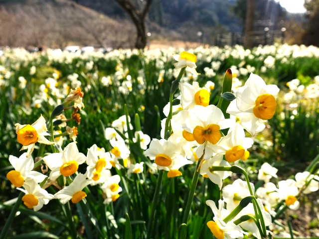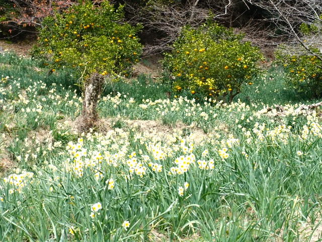 車でダムまで移動し、人出の多い親水公園に着いたのち、本命のスイセン鑑賞の時間です。たかがスイセン、されど道の両側に咲くスイセンの群落にはビックリです、一度は是非見ておきたいものです。八雲神社付近まで足を延ばし、スイセンと夏みかんだらけの景観を十分楽しめました。