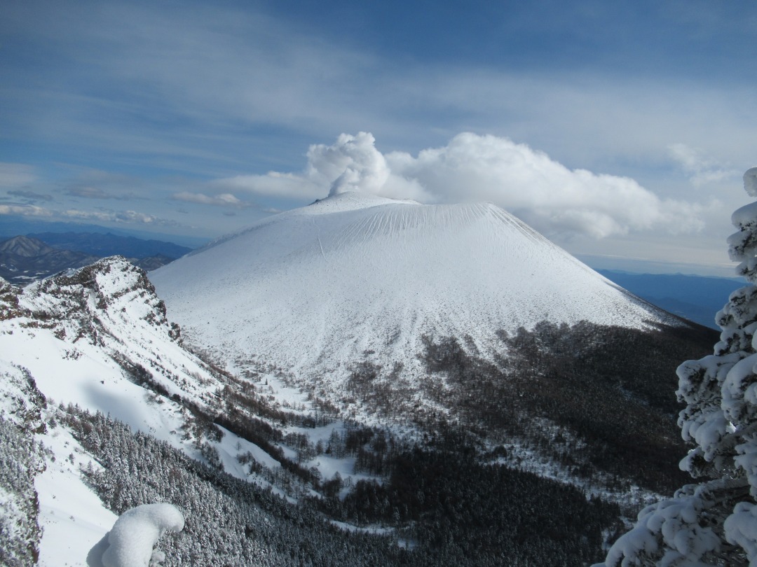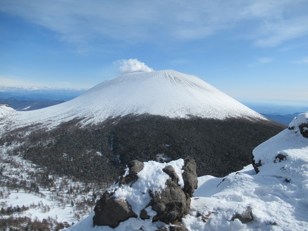 <詳細報告>小山を5:15に出発、佐久北ICから車坂峠に向かうが、峠までの道路に雪は無くノーマルタイヤでも行けそうです。8時過ぎに駐車場に着きましたが既に満車状態、何とか停められ槍ケ鞘に向け出発、気温ー8℃ですが無風で寒くはありません。登山道には雪はありますが、固く踏みしめられ歩き易く、風も無いのでコンディッションは最高です。展望地からは八ヶ岳、富士山、北アルプスの眺望が良く、槍ケ鞘からは大きく真っ白な浅間が眼前に飛び込んで来ます。トーミの頭で景色を楽しんでいると、ともさん、みつまんさんグループに出合い、黒班山で大休止中に先を越されました。蛇骨岳で再会し皆さんとスナップ、人出は多かったものの、久しぶりに雪山の景観を満喫出来ました。