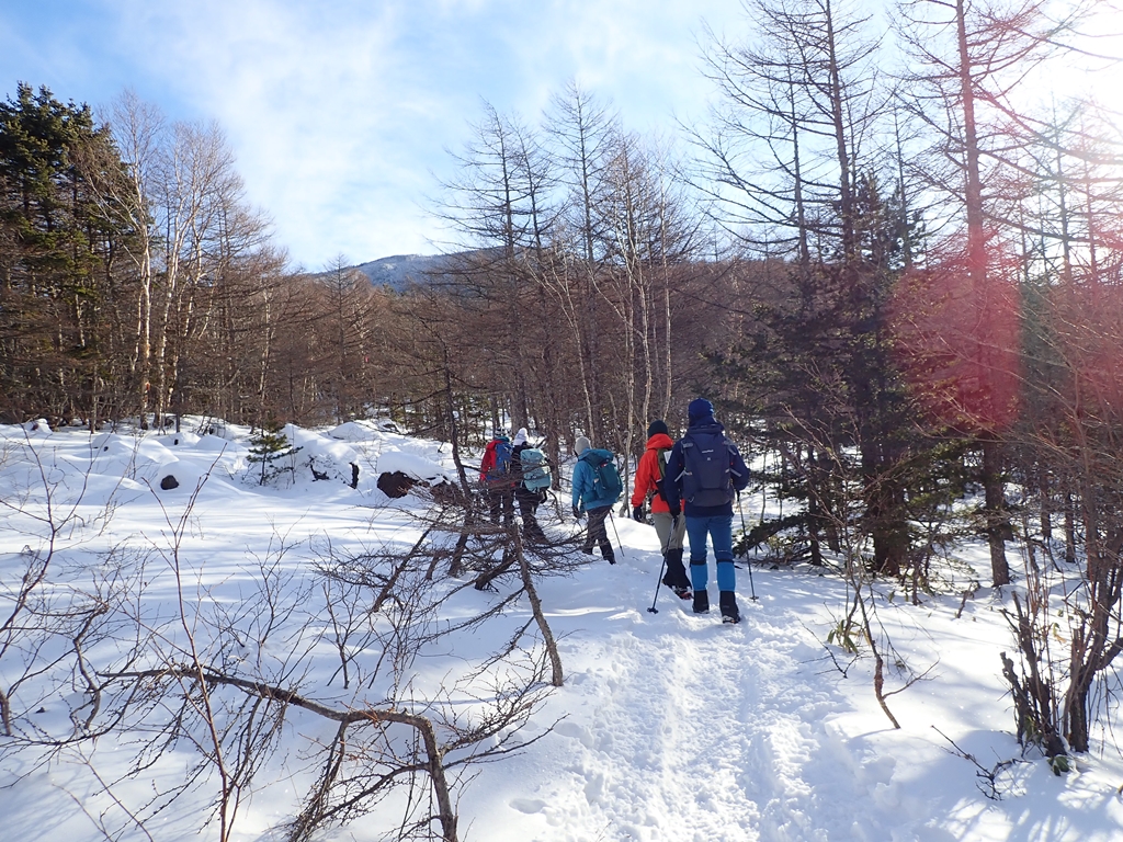 蛇骨岳でゆっくりと休んで下山開始。下山と云っても黒斑山までは少し登り基調になる。黒斑山で小休止。ともさんが「下りは眺望はありませんが中コースで良いですか。」と確認したが、誰からも異論はなし。みんな久しぶりの雪山で疲れ気味なのだ。中コースは谷の樹林帯内のコースで、尾根のコースと比べると眺望はないが、アップダウンがないので楽なコースだった。一気に下った。久しぶりのアイゼン歩行で脚が疲れていたようだ。私は途中で脚が痙攣しそうになった。久しぶりに芍薬甘草の効果を実感。車坂峠の少し下の駐車地に近い脇道へ下山した。最後まで無事歩けたのだが、スパッツを外したり、靴を履き替えたりしている時に何度も脚が攣りそうになった。