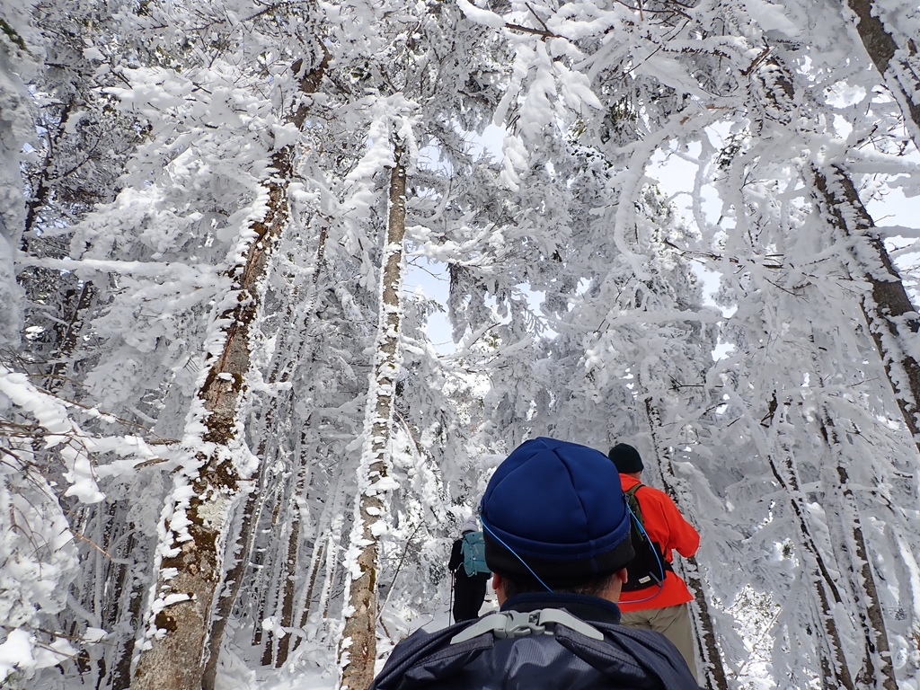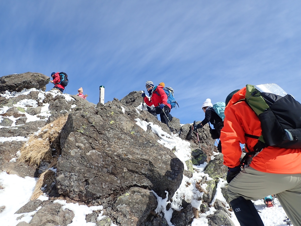 さらに45分ぐらい登って槍ヶ鞘へ着いた。今年の浅間はガトーショコラではなく、生クリームたっぷりだった。雪山はこうでなくちゃ。北側を見るとトーミの頭には大勢の登山者がみえた。そこに登っていく人も4-5人いる。短いが急な傾斜を下るとトーミの頭への登りが始まる。右側は断崖だ。「大きな地震がきたら左の樹林に逃げ込めるかな」と考えながら登ったが、いざとなったらそのような行動がとれるかどうかわからない。