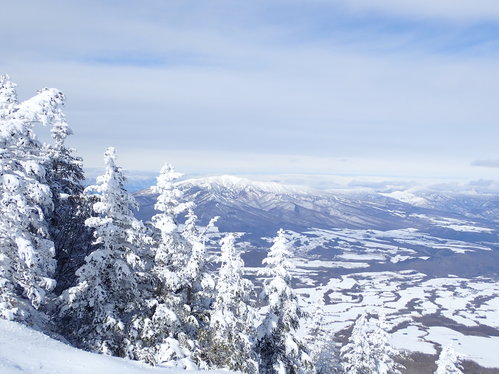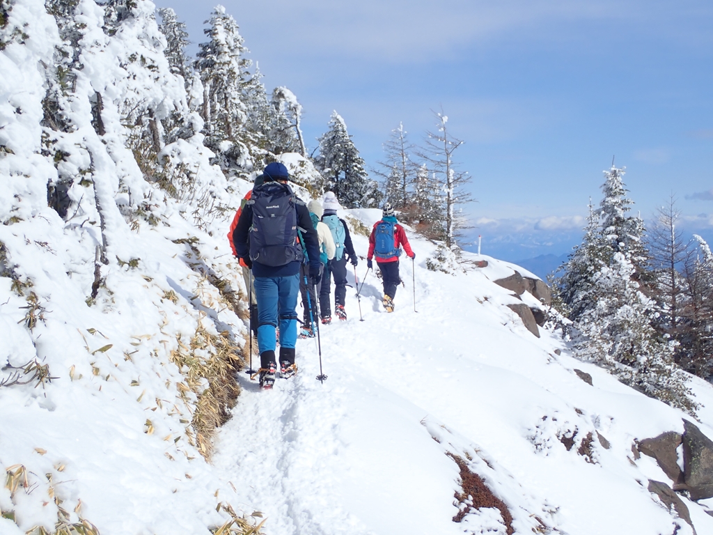 登山開始。私が前回来たのは5年前の12月で、その時は雪が少なくてがっかりしたが、今回は20cmぐらいは積もっていて、雪山という感じがする。1時間近く登って展望の良い場所で一休み。正面に高峯山がで~んとあって、その左には中央アルプス、八ヶ岳が見える。高峯山の先に北アルプスが見える。乗鞍、穂高、槍、鹿島槍まで見える。東篭ノ登山の右に見ていたのは白馬岳かと思ったが、火打・妙高、手前に四阿山だったようだ。ここで私たちもアイゼンを装着。少し汗をかいて来たので1枚脱いだ。