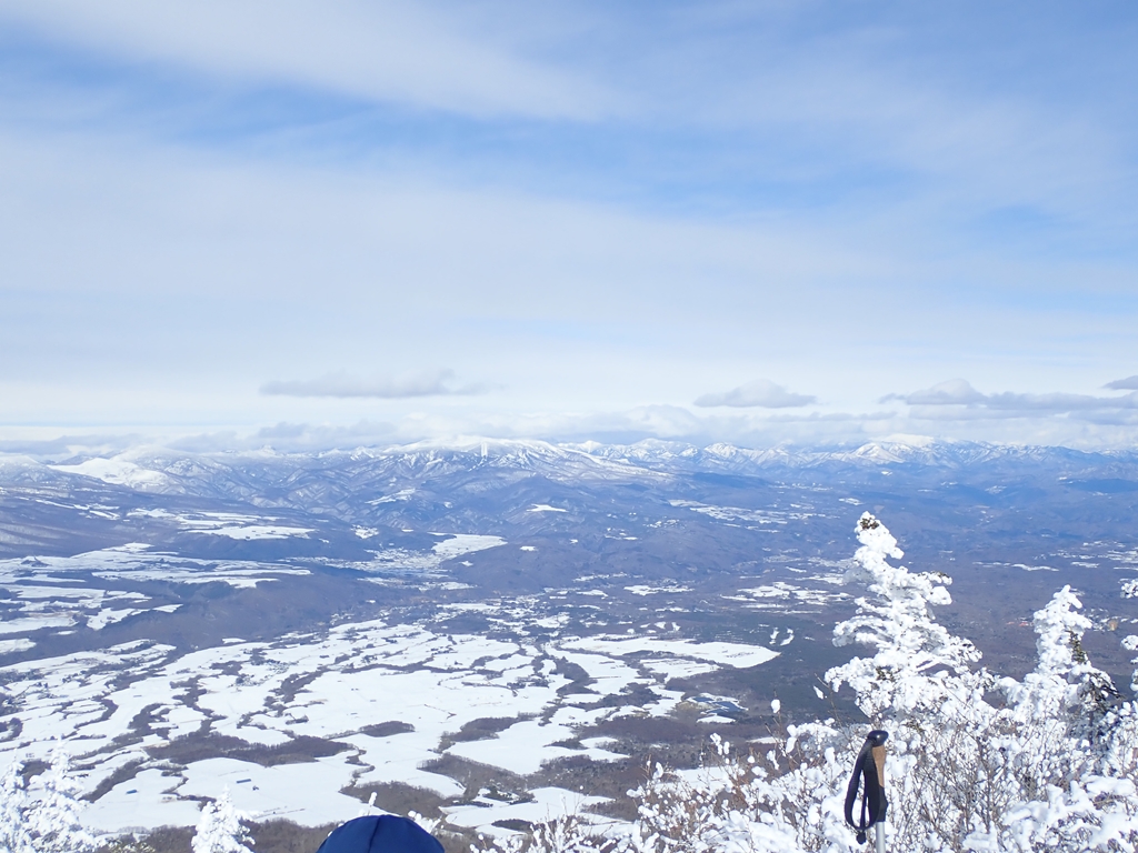 トーミの頭でこなっちさん夫婦に会った。今回は別行動で同じルートを歩いている。少し、眺望を楽しんでから山頂をめざした。樹林帯内の道を20分程歩いて山頂に到着。山頂にはドコモ・AU・ソフトバンクのアンテナが建ってる。浅間山の噴火観測施設もあるらしい。山頂は賑わっているので、そこで休まずに蛇骨岳へ向かった。30分弱で着いたが、途中、東側が切れた絶壁の上を歩く場所が数ヶ所あり、高所恐怖症の私としては嫌な感じだった。しかし、蛇骨岳からの眺望は想像以上だった。山頂標識のある場所は広くなっていて南以外の三方向が見渡せる。四阿山・草津白根山、白砂山が良く見える。北アルプスは樹林に隠れて見えないが、四阿山の左手に妙高・火打が見える。白砂山の右には谷川岳、尾瀬の山々が見えるらしいが、特定は難しい。山の手前下には、夏には高原レタス・キャベツが栽培されているという畑が広がっていた。少し先まで行って仙人岳への降り口に行くと、北側がきれいにみえた。仙人岳、Jバンドはもうすぐ先なのだが、そこまで行く気力はない。