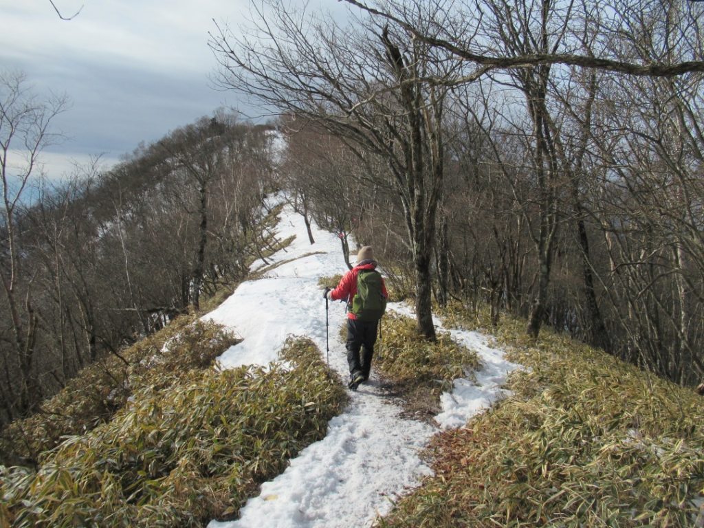 <詳細報告> 近場の赤城でも氷瀑を見られるとのことで、その見物と蕎麦を食す目的で、出掛けてみました。先週の黒班山と同様、道路に殆ど雪は無く、山肌もさほど白くはなく、小沼平駐車場も空いています。気温ー4℃、風は少々ありますが寒くはなく、長七郎山まで一登り、山頂からは皇海山、日光の山々、四阿山、草津など見渡せました。ここから粕川源流まで200m程下り氷瀑へ向かいますが、所々土が露出しており雪も少ない。氷瀑は崩壊が可成り進んでいますが、そこそこの景観で団体の方もいて賑わっていました。大休止後、小沼まで登り返し凍結した湖面の真ん中を気持ちよく歩き駐車場に戻り丁度昼時、麓のS庵でお目当ての蕎麦を美味しく頂き帰宅しました。