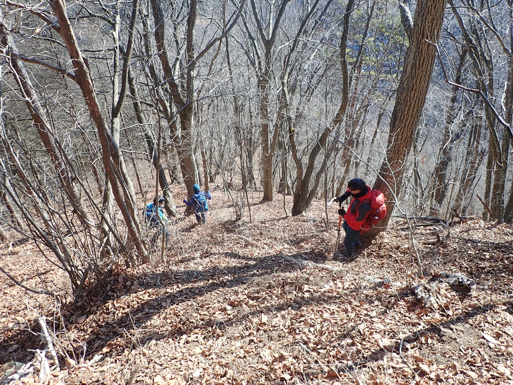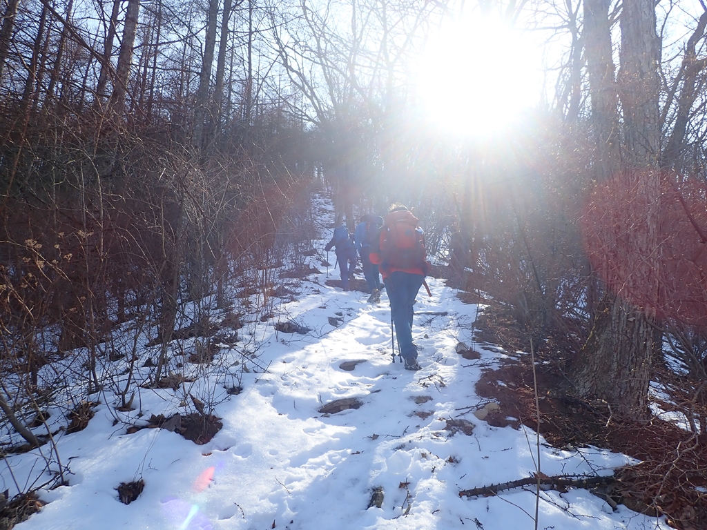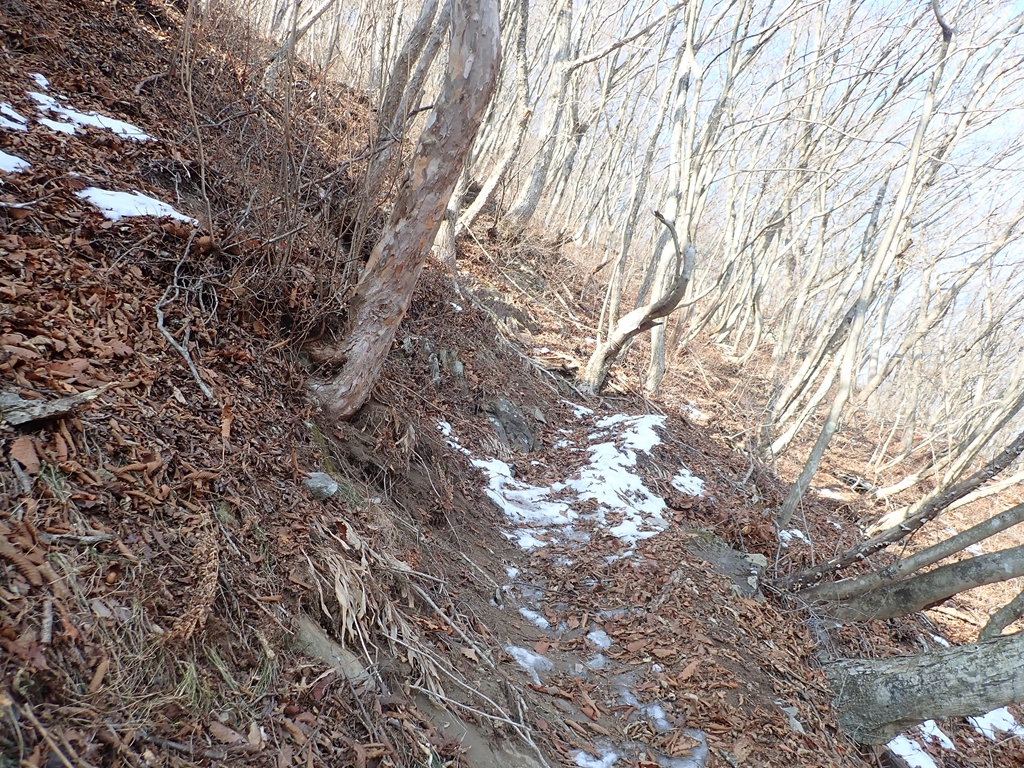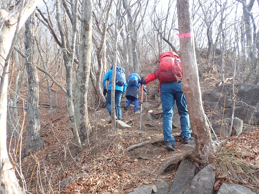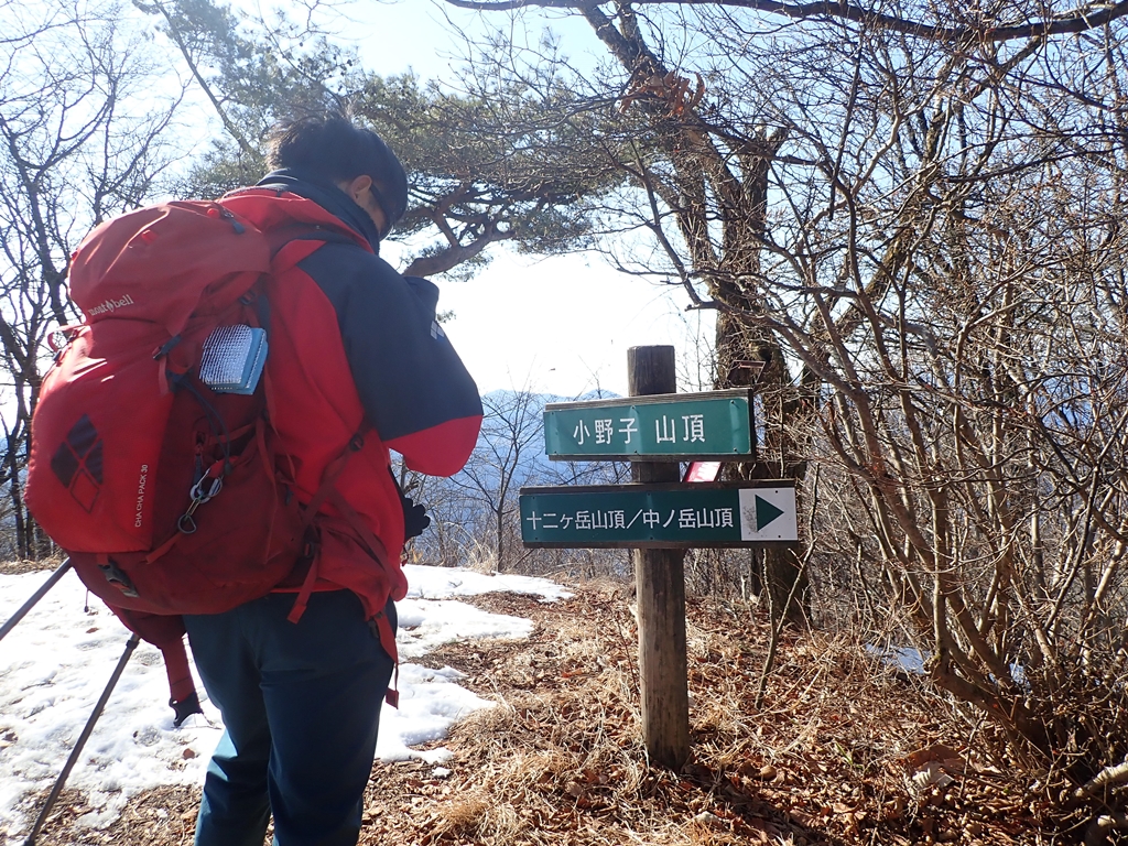 十二ヶ岳からの下りは危ない場所があった。男坂の急な斜面を下った。最初は岩につかまって下れたが、中程に、いつもなら変哲もない場所なのだろうが、雪が凍結して、おまけにホールドの取れない場所が数メートル程あった。必死に手で斜面をプッシュして「そおっと」下った。無事通過できたが、アイゼンがあればもう少し楽できただろう。十二ヶ岳から130mほど下ってから、登り返した。雪の残る登りだったが傾斜が緩やかだったので助かった。中ノ岳山頂で小休止してアイゼンを付けた。私はチェーンスパイクを貸したので、軽アイゼンを付けた。そこで大失敗。紐の長さを冬靴に合わせて調整したままだったのだ。紐の調整をやったので時間が掛かってしまった。もう一つ失敗したのはきつく締めすぎたこと。中ノ岳を下り始めると足の甲が痛くなってしまった。我慢できず途中で少し緩めた。この軽アイゼン、5-6年前に買ったのだが使ったのは初めて。何度か装着する練習をしていたのだが実際に山を歩いてみないと上手くはできないものだと痛感した。中ノ岳からの下りは雪は無し。ただ落葉が多かったのでアイゼンが滑り止めになった。中ノ岳から150mも下ってから小野子山へ170m程の登り返し。そこには雪が残っていたがアイゼンで問題なく登れた。しかし、アップダウンの連続で脚は大いに疲れて来た。山頂は冷たい風が吹いていたので、少し南に下りて風を避けて大休止。