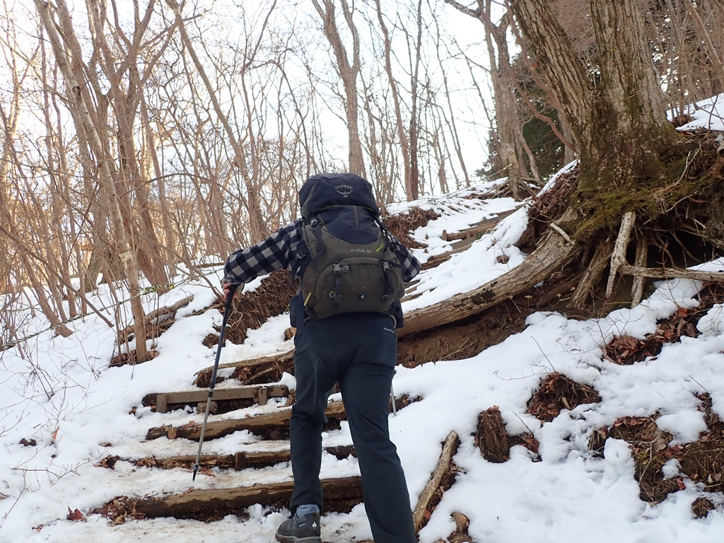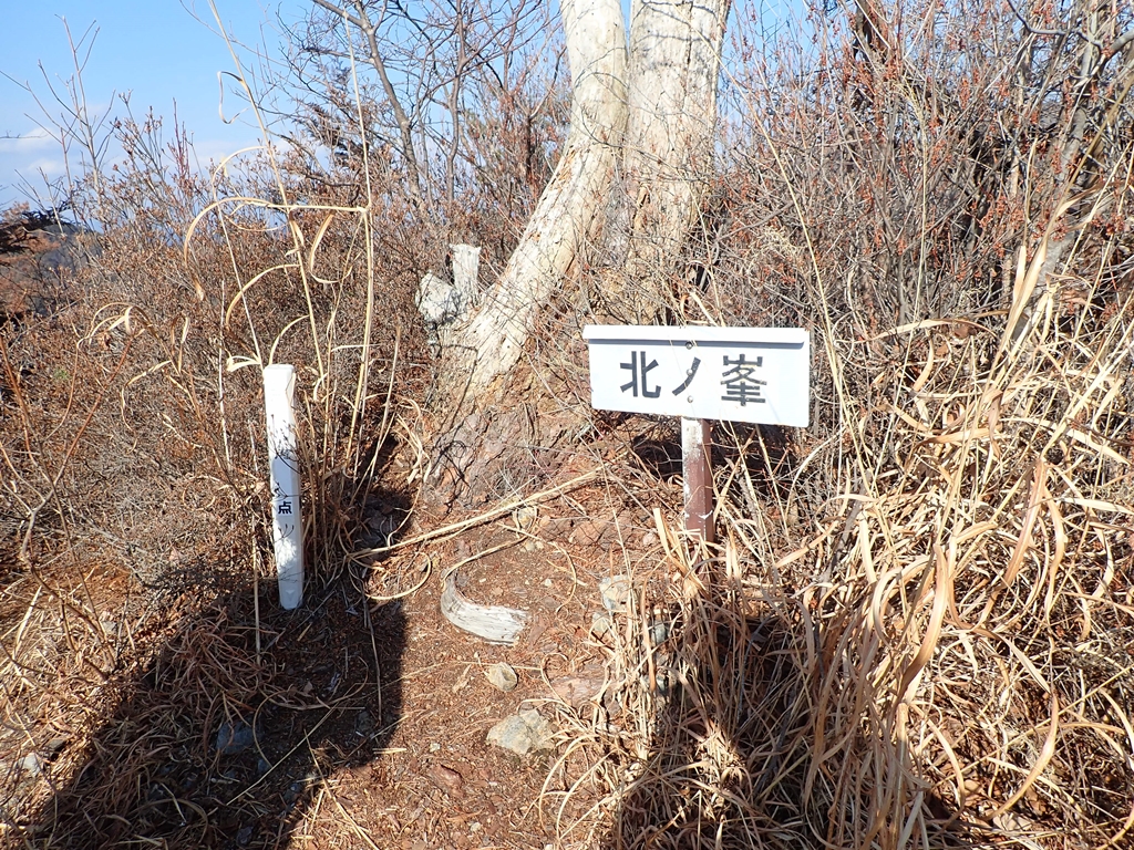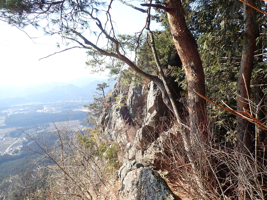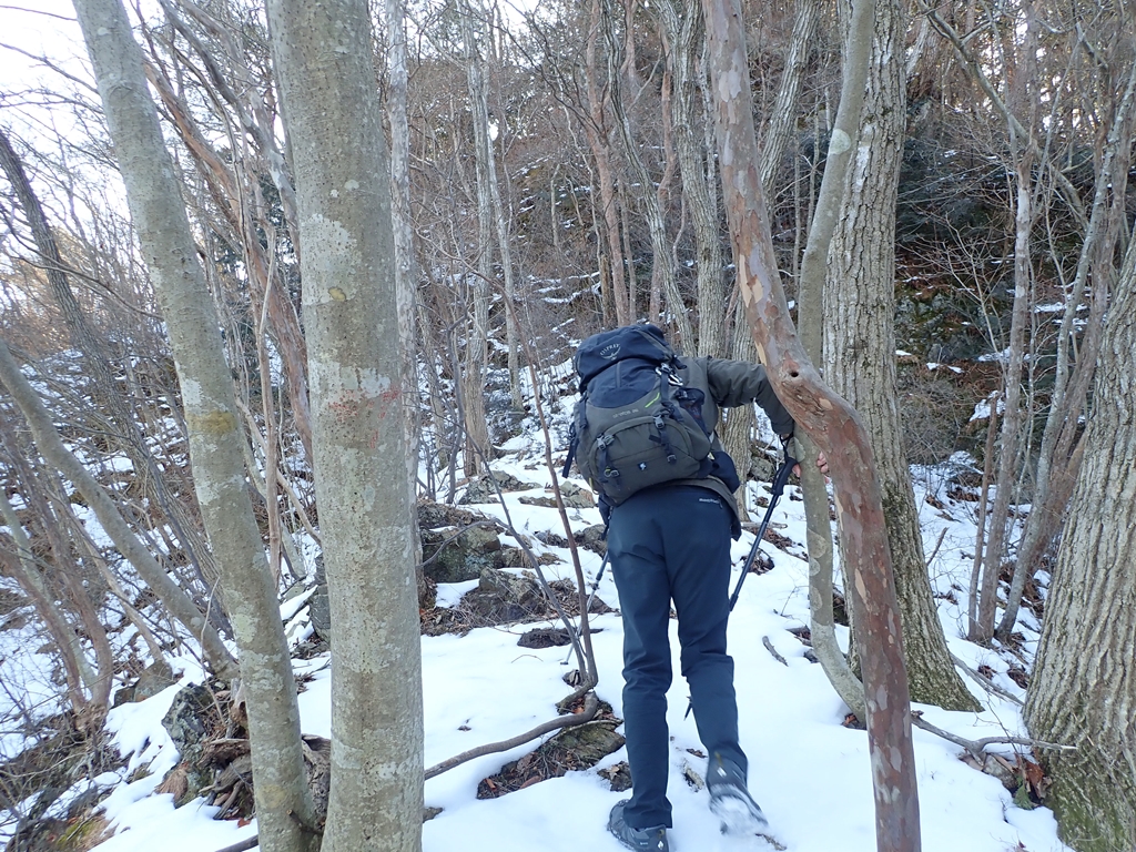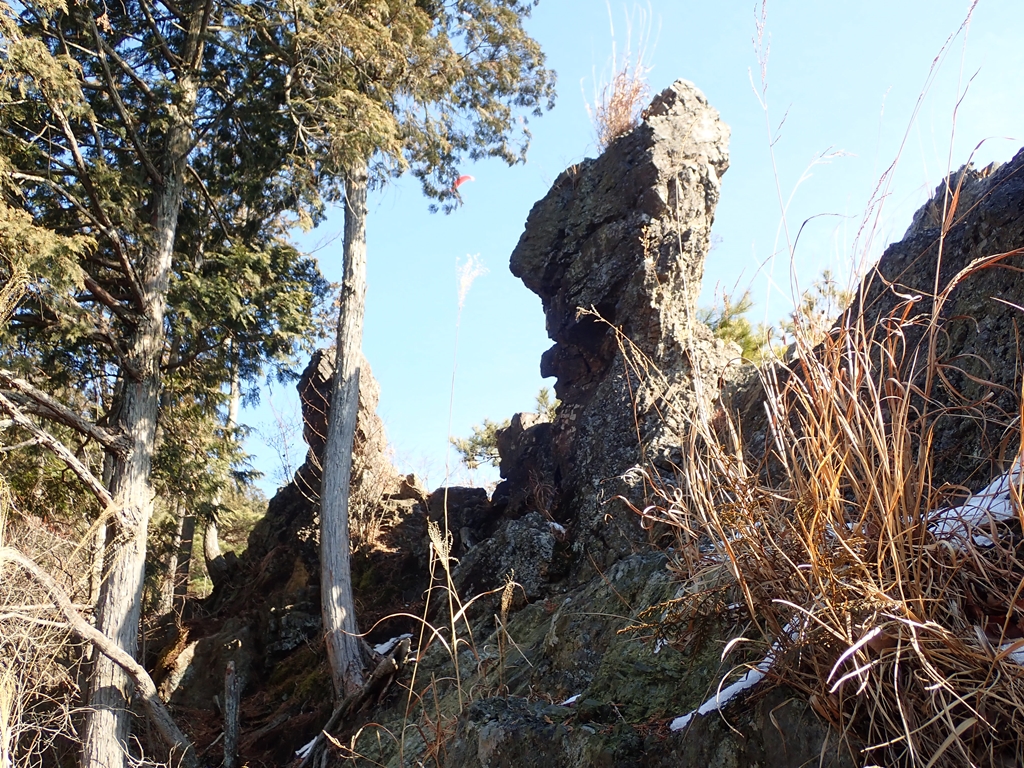 赤岩山から西に下ると大岩にぶつかった。「猿岩」の標識がある。そこから北西に延びる尾根に移って少し下るとまた大岩にぶつかった。上にクサリが見えたが左に巻道があるようなのでそちらに進んだ。大岩はその後ろにも続いていて、巻道は数分続き、途中、足場の狭い場所もあった。巻道が終わって振り返ると大岩が鎮座していた。次に機会があれば挑戦したい。今回は疲れ気味なので巻いて正解だった。「北ノ峯」に到着。標高432.7mの三角点がある。そこからの下りは急だったが、掴まる木が多く、岩場にはクサリがあった。やがて足元の雪が増えてきた。「無縫塔」入口あたりまで下りてくると傾斜が緩やかになり、植林地に入って来た。有名な作業小屋まで下りて一休み。そこから10分で駐車地に戻ることができた。