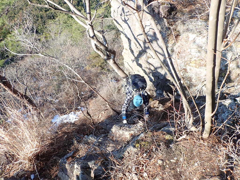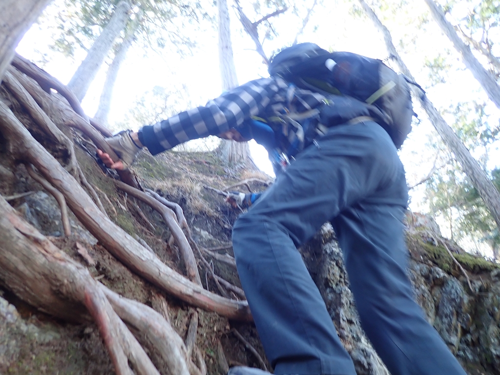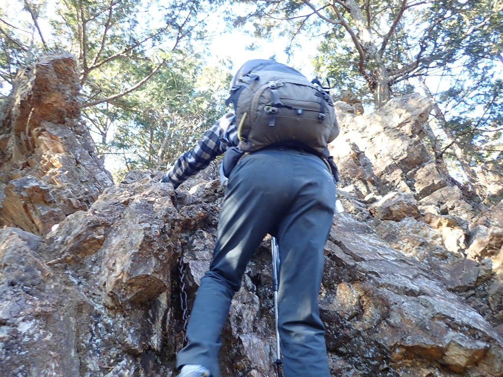 中岩の東にある大岩が最初の難所だった。かつて岳連の講習会でここで懸垂下降の練習をしたが、登るのは初めてだ。クサリがあるので登れそうだが、一応確保してもらうことになった。準備していると上から女性の声がする。3人パーティが下りてきた。一番後ろの女性が前の二人を確保して指示を出している。ガイドなのか、山岳会のリーダーなのかは不明だが、東京から来たという事だ。ヘルメットにハーネスと立派ないでたちだった。女性たちが下りてから私たちが登り始めた。まずさとうさんがチムニー状の割れ目を登っていく。次にロープ確保された私が登る。クサリがあり、ホールドも多いので難なく登れたが最後まで気が抜けないので確保があると少し気が楽になる。中岩に到着。南に視界が広がる。そこからもいくつか岩場を下るが二尊岩手前の下りは特に落差の大きい岩場で、クサリがあるが、何度か事故も起きているようだ。赤岩山へは木の根を掴んで急傾斜を登った。ここの木の根はしっかりしているものが多くて安定感がある。赤岩山は標識だけの面白みのない山頂だった。もう少し先に下って日当たりの良い場所で大休止した。