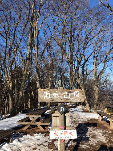 <詳細報告>6:30大川戸駐車場に到着した。気温-4℃で車の中が暖かかったためか余計に寒く感じた。林道から三登谷山に向かう登山道はなだらかで残雪は殆どなく心地良かった。三登谷山頂上に到着し、日光連山を眺めながら鹿嶋から来られた2人組と雑談しながら小休止した。三登谷山を少し下ると展望が開け、富士山、筑波山が良く見えた。途中地元の方と思われる登山者と数名出会った後、雨巻山頂上に到着した。頂上には誰もおらず気温-2℃で少し風が出てきたのですぐに展望台に向かった。2~3m程の木製展望台から杉の合間に富士山が良く見えた。小休止してから御嶽山に向かう下りから残雪が凍っていたので7~8年前に購入した軽アイゼンを初めて使い慎重に歩いた。次第に慣れてくると滑らない安心感が増し普通に歩けるようになった。御嶽山頂上で八溝山地、芳賀富士を眺めた後、鎖場を下りて足尾山に到着した。足尾山頂上のベンチで蒸気機関車の汽笛を遠くで聞きながら自家製メンチパンとカップラーメンを食べて一休みした。足尾山沢コースでは倒木の下を潜ったり、沢で滑りそうになったり、浮石でバランスを崩すなど冷や冷やしながらアオキの茂みを進むと次第に登山者が多くなり、外国人グループとも出会った。さらに下ると焼きたてのピザの香ばしい匂いと子供たちの歓喜の声が聞こえてきて大戸川駐車場に到着した。朝3台しかなかった駐車場は満車の状態となっていた。天候恵まれ、案内板も分かりやすく道も整備されていて快適な山歩きができました。